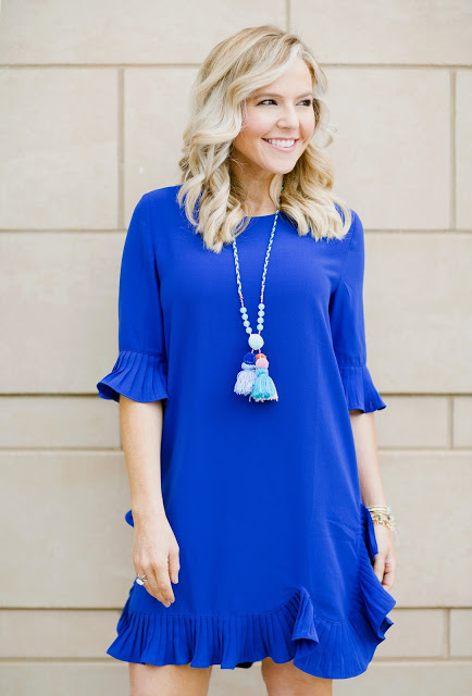 Bright colors for spring… I can’t get enough. I feel like everyone looks so put together in neutrals, but you know by now that this lady loves big, bold, saturated color pops… from walls in our house to flowers to everyday ensembles, I need color to properly welcome in spring and this new cobalt blue frill sleeve dress is no exception!