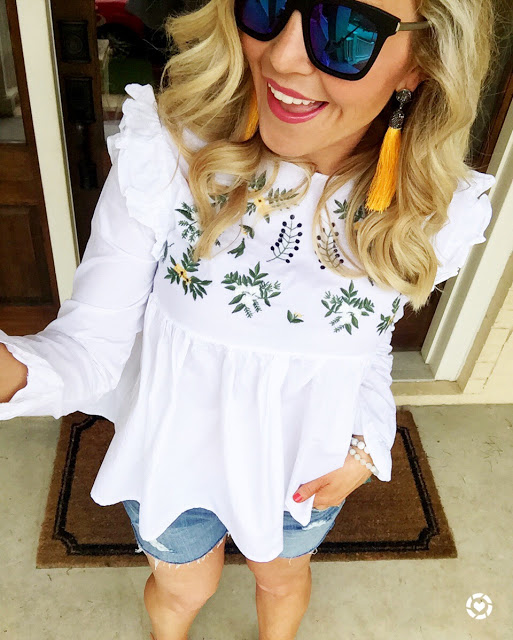 You went crazy over this ruffled embroidered top… even better, it’s just $23 and has been restocked online! It also runs TTS for those wondering. These cut-offs denim shorts are also perfect in length for us mamas constantly running around. And don’t forget about these GORG and oh so light tassel earrings… they come in a ton of colors including red, cobalt, black, hot pink and navy! P.S. here is the link to my black with blue mirrored sunnies, too…