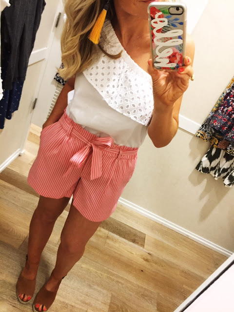 Next up are outfit obsessions from my recent shopping trip to Loft. You’ll see a ton of these next week when we’re on vacation so be sure to follow along for the beach vacay… This One Shoulder Eyelet White Top and Striped Tie Waist Shorts spell casual, yet cute and colorful = just my style! Both run TTS for anyone shopping these separates. And here’s the link to my favorite wedges [under $60] and floral iPhone case as well.