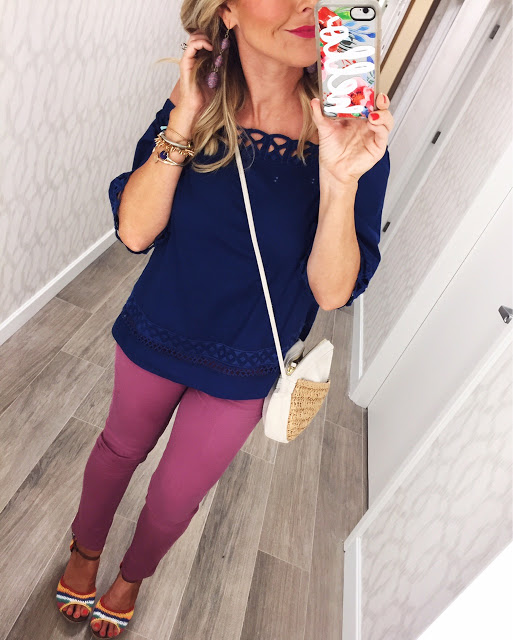 These plum colored jeans are a perfect spring silhouette and love the brightness… they run a little large and have some stretch so size down! I paired them with this top [which just happens to be sold out online] but here are a few options that are similar [one and two]. And these sparkly baubles dress up any ensemble and come in a ton of colors! P.S. let’s not forget about these rainbow crochet wedges… I got so many compliments and they are VERY comfortable and under $70–expect to see these a lot this summer!!