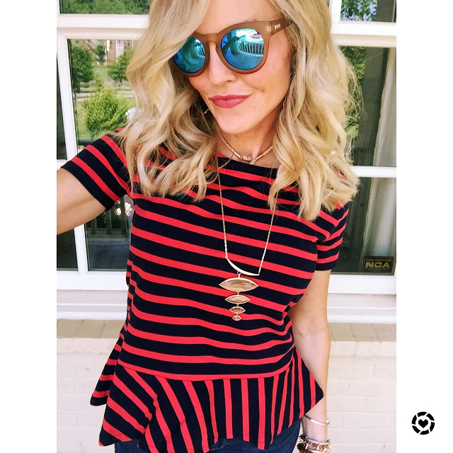 Finally, my friends at JCrew Factory have been dominating it in terms of accessible and affordable style so far in 2017… casual essentials that are on-trend and made well for the price! This striped peplum top has a nautical look, runs TTS, and is a ticker knit so it is easy to dress up or down. It also comes in solid ivory and navy, too. As for the accessories, of course they’re Kendra Scott and all rose gold… the Cooper Pendant in Rose Gold Drusy and the Morris in Gold Dusted Glass. And for those asking about these mirrored sunglasses, they are sold out online, but here are a few styles [one and two] that are similar and budget friendly, too.