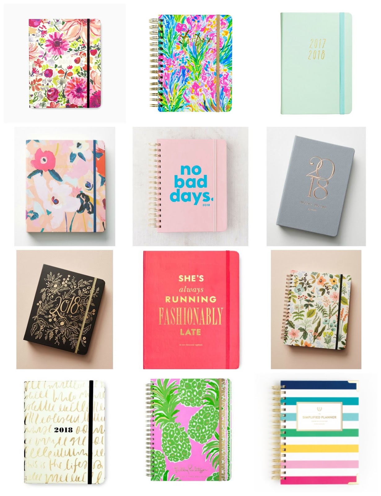 8. Fashionably Late Planner [$36] Concealed spiral bind design contains monthly and weekly spreads, gold foil stickers, and laminated dividers… size 7.5(W) x 9.25(H)”