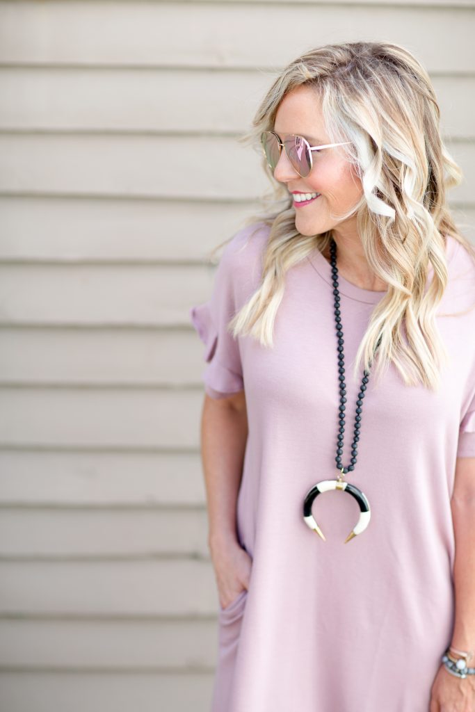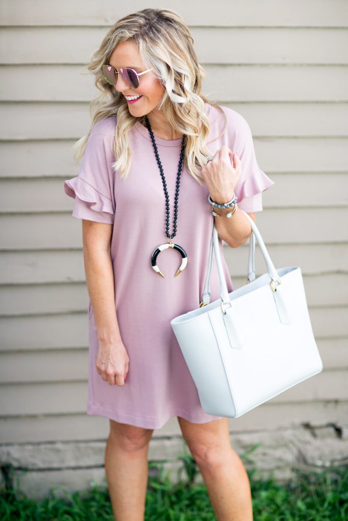 Ruffle T-Shirt Dress | Ebony and Ivory Tusk Pendant | Jaylen Black Wedges | Pink Mirrored Aviators | Dagne Dover Legend Tote