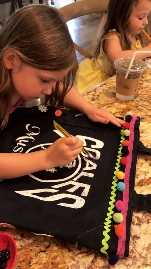 The week before we went back to school, I treated each of the girls to a day date, so we could spend some quality time together, doing a little lunching and shopping for shoes and of course, spoiling them before getting back into the daily hustle and bustle. Thank goodness they happily obliged and we had the best time! We then had a few of our friends over for a tote bag decorating party… Caroline had chosen pom pom fringe and applique patches for hers and then purple glitter for some extra “bling”. That’s my girl, more is always more 😉