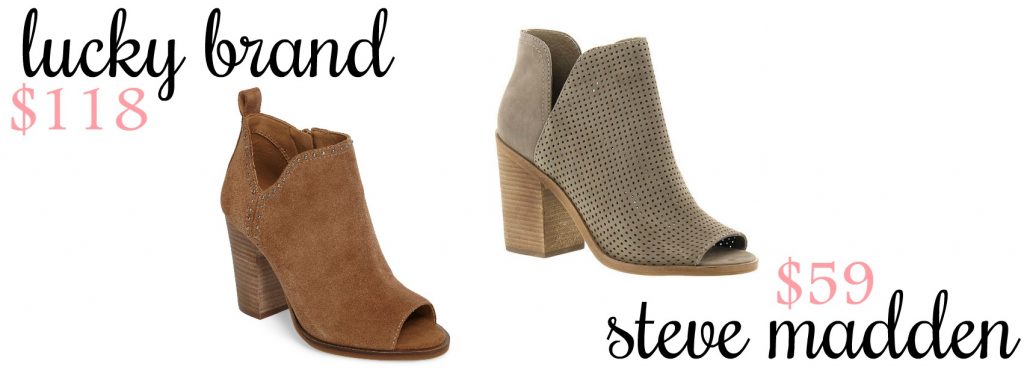 Moving onto shoes, a good pair of booties can take you anywhere! I love the peep toe option, because you can show off those fall nail polish colors and they work well with pants, dresses, skirts… any kind of bottom you pair with them!