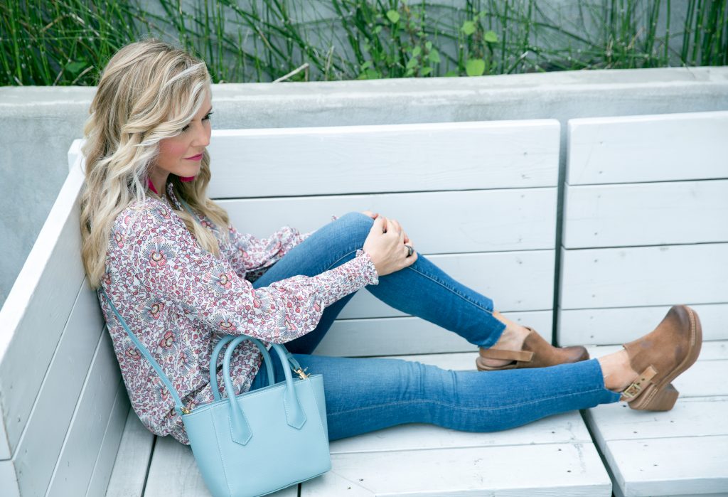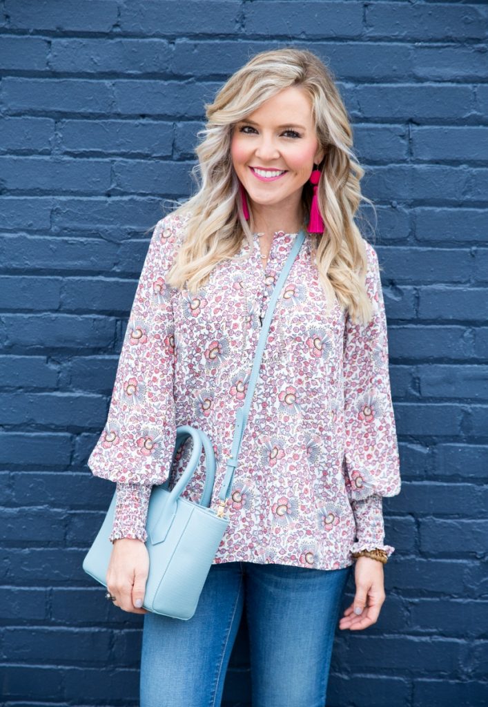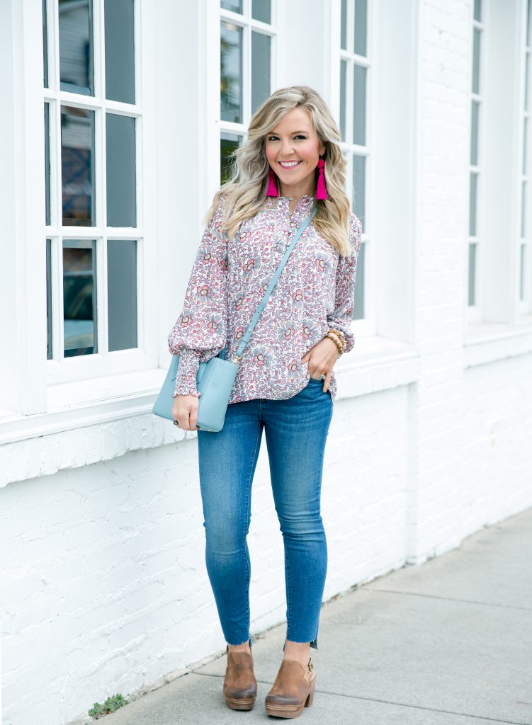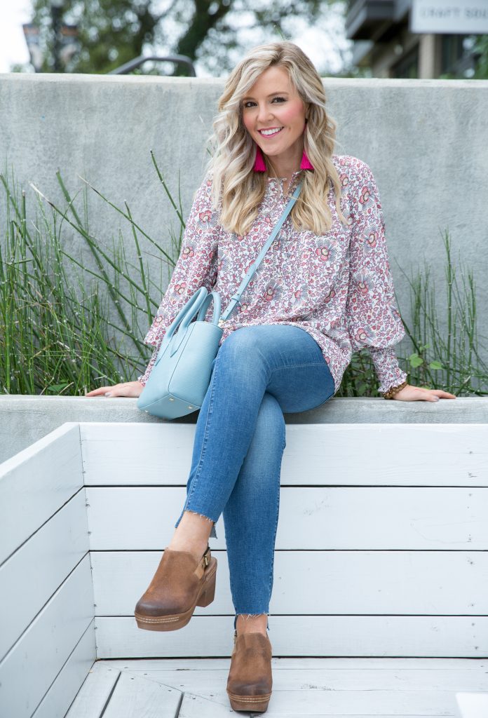 Flowerbud Smocked Cuff Blouse [now on sale for $33] | Modern Step Skinny Jeans [just $48] Dagne Dover Petite Tote | Pink Pom Pom Earrings | Slingback Clogs