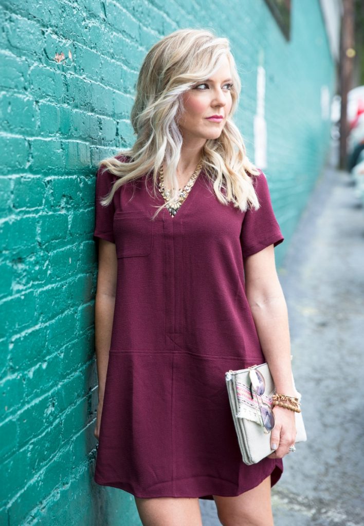 For all you dress obsessed gals like me, this Hailey Crepe dress comes in FIVE hues for fall, too… Black, Bleached Sand, Mustard, Olive, and Winetasting, which is the color I’m wearing above. As the Lush brand can run a little small/short, I sized up to a Small, which is a bit roomier and less fitted, perfect for fall and layering up with other pieces.