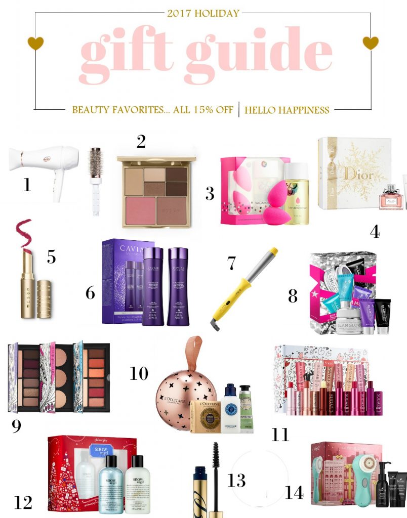 1| T3 Featherweight Luxe 2 Hairdryer [on sale for $199- I LOVE mine and it saves so much time because it’s super quick] 2| Stila Perfect Me Palette 3| BeautyBlender BB Clean Set 4| Miss Dior Parfum Set [my absolute favorite perfume… I’ve worn it for years and still love it] 5| Matte’ificent Lipstick [Color is Soiree and perfect for fall and winter] 6| Alterna Caviar Moisture Duo Hair Care Set [for blondes, it’s THE best in keeping locks hydrated] 7| DryBar Wrap Party Styling Wand [my favorite wave-making hair tool] 8| Glam Glow Let it Glow Super Mud Gift Set [for the spa-like mud mask lover] 9| Drawn in and Decked Out Shadow and Highlighter Palette [only $39… yippee] 10| L’Occitane Holiday Ornament Gift Set [just $14… a perfect teacher gift!] 11| Sugar Lip Beauty Box 12| Philosophy Snow Angel Duo 13| Estee Lauder Sumptuous Lash Mascara [THE best mascara… EVER] 14| Clarisonic Porefecting Set [Mia 2 Skin Care System]