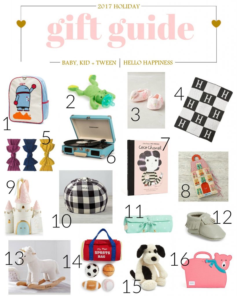The party is just getting started!!!! I know it’s been a whirlwind of shopping adventures for most of you out there… and thanks so much for letting me be a small part of your Christmas festivity, as well. Today, we’re back to business for all things holiday gift giving and this time I am answering some of your prayers as a ton of you have asked for Baby, Kid + Tween Shopping Guide. A roundup of the latest and greatest, with special selections for each of the little ones you love most can be found below: