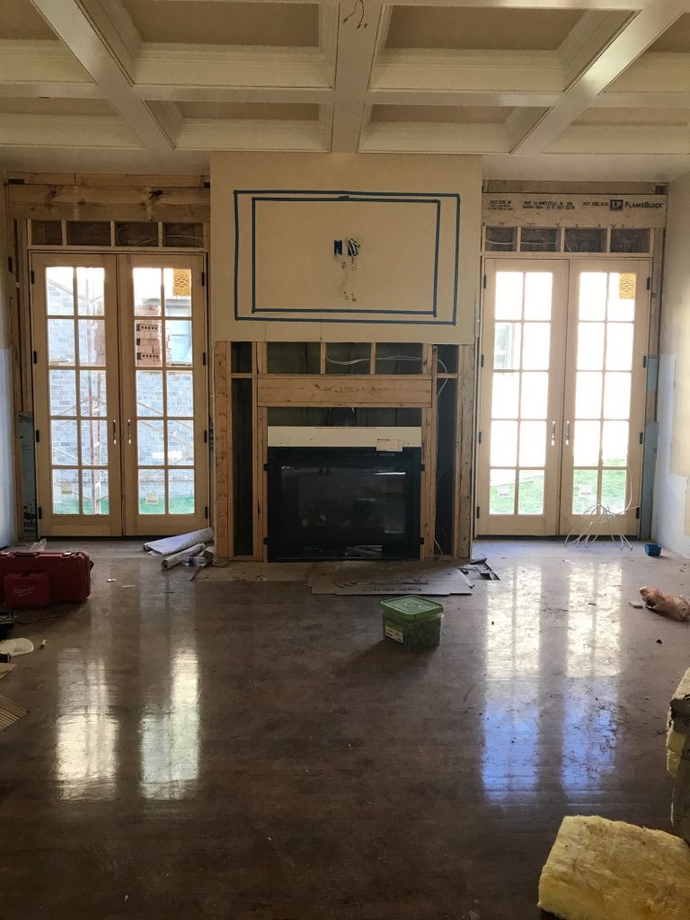 The family room is looking GREAT!!! No more ugly built-ins or red onyx fireplace mantle, but two sets of french doors that open up this space and make it happy and bright. And yes, we are keeping the coffered ceiling detail!