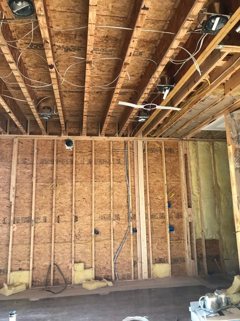 The current state of our kitchen… demolished down to the studs, but Kendall and Ron met with the electricians last week and they have already finished the layout of lighting, outlets and such–thank heavens for a designer and contractor who are just as specific about details as Jeff and I 😉