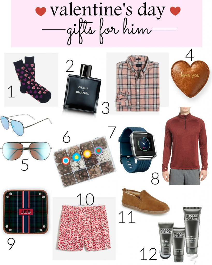 1: Candy Heart Socks 2: Bleu de Chanel Cologne 3: Washed Plaid Shirt [yes, my guy LOVES to wear pink!] 4: Love You Leather Paperweight 5: Living Large Aviators [because he can NEVER have enough sunglasses] 6: Dark Chocolate Tackle Box [for your outdoorsmen who love a good treat] 7: Fit Bit Blaze Smart Watch 8: Quarter Zip Pullover [under $40 for the win] 9: Personalized Snap Valet 10: Hearts and Arrows Boxers 11: Shearling Lined Slippers 12: Clinique for Men Skincare Set