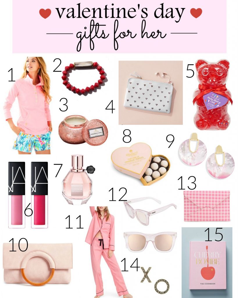 1: Captain Popover 2: Uganda Bracelet 3: Voluspa Glass Candle 4: Heart Zippered Pouch 5: Dylan’s Candy Bar Gummy Bear [now you’re speaking my love language] 6: NARS Velvet Lip Duo [come to mama!] 7: Flowerbomb Perfume [one of my fav scents!] 8: Charbonnel Chocolate Truffles 9: Diane Statement Earrings 10: Faux Leather Circle Clutch |11: Cool Pink Pajamas Set 12: After Hours Pink Sunglasses [I think I might NEED these] 13: Gingham Envelope Pouch 14: XO Stud Earrings 15: Cherry Bombe Cookbook