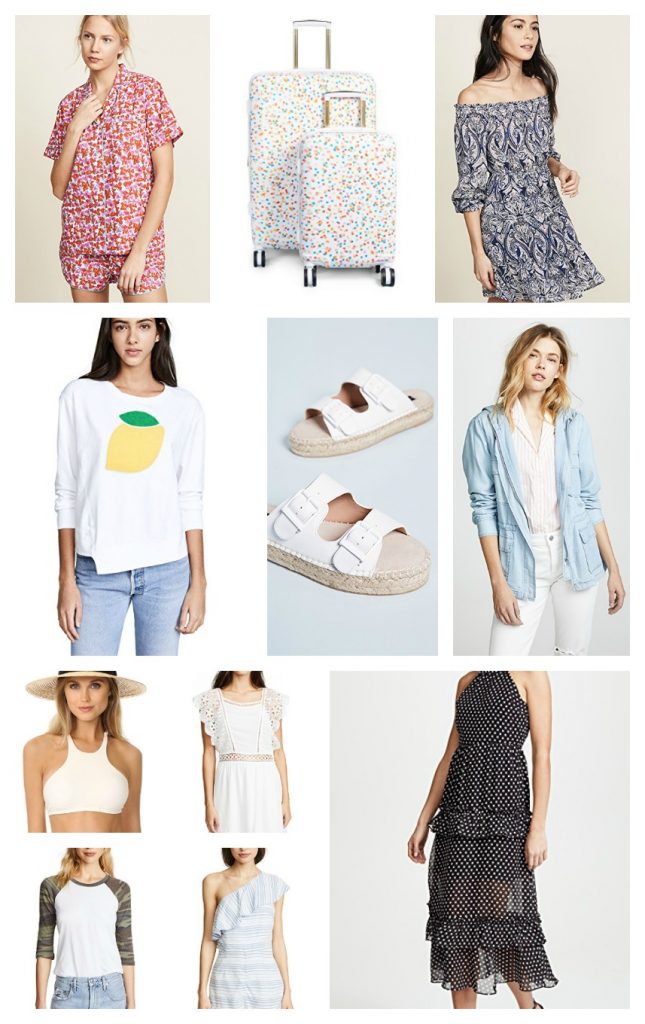 Lulu Pajama Set | Confetti Two Piece Luggage Set [is this not FAB?!?!] | Elroy Paisley Dress | Lemon Sweatshirt [squeeze the day!]| Lapis Espadrille Sandals [a little dressier than Birks so I’m kinda digging these] | Jeslyn Jacket | Joanna Hat [less than $50 + up to 25% off] | Eyelet Dress | Camo Baseball Tee [crazy for camp over here!] | Colleen One Shoulder Romper | Polka Dot Maxi Dress