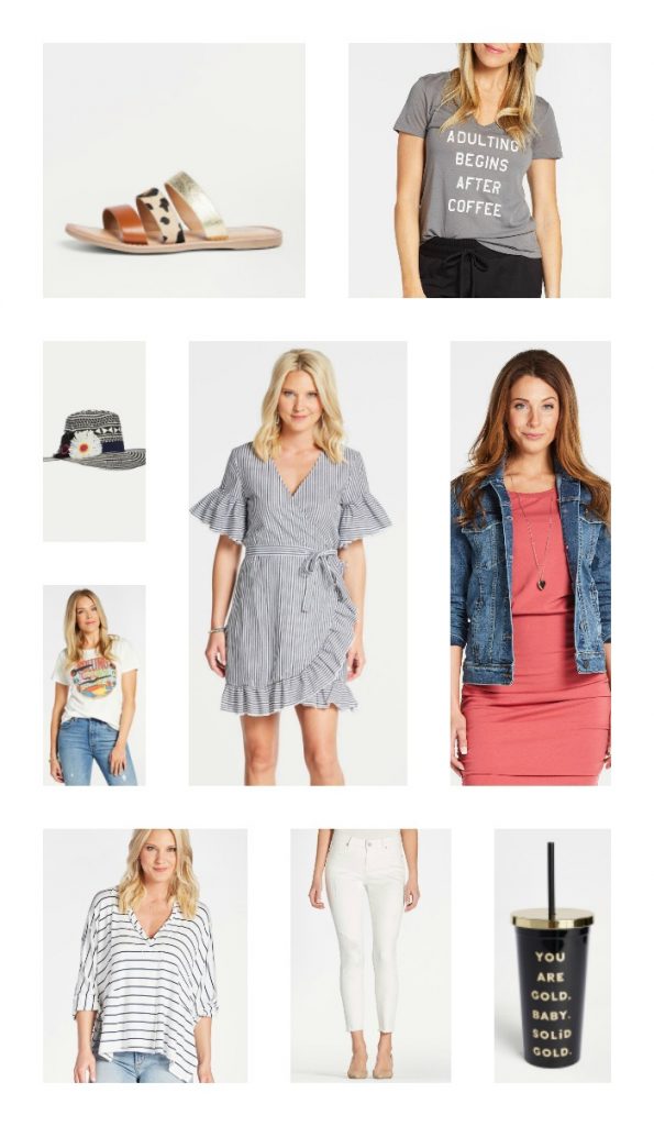 Leopard Metallic Sandal | After Coffee TeeWow Hat | Striped Wrap Dress | Rolling Stones Tee | Taylor Denim Jacket | Striped Cant Fool Me Tee | White Raw Hem Jeans [just $61… runs TTS] | Deluxe Sip Sip Tumbler