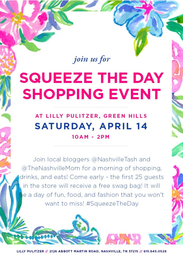 Squeeze the day–it’s super sweet and simple and it’s the detail behind THIS Saturday’s Spring Shopping Event with my friends at Lilly Pulitzer! For all of you local ladies, come join in the fun at the shop in The Mall at Green Hills and make it a morning out for yourself. Here is a rundown of all the details: