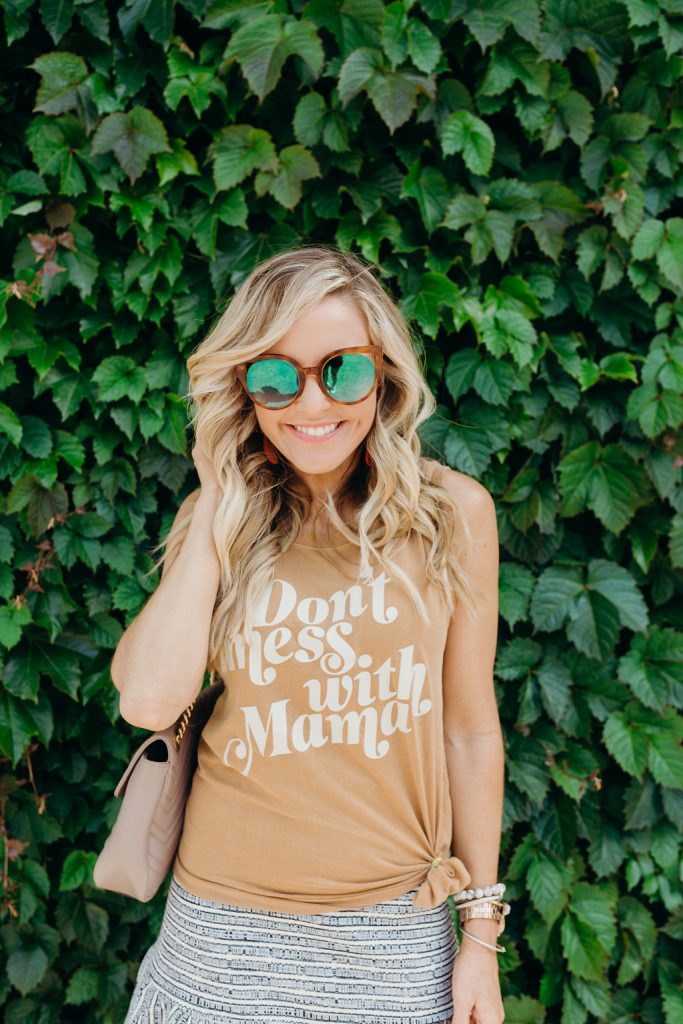 Don’t Mess with Mama Tank | Ruffled Skirt | Gold Bow Wedges | Penny Sunglasses | Quilted Shoulder Bag