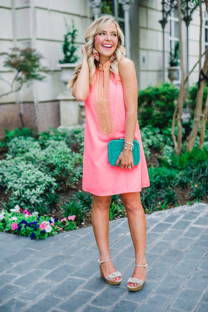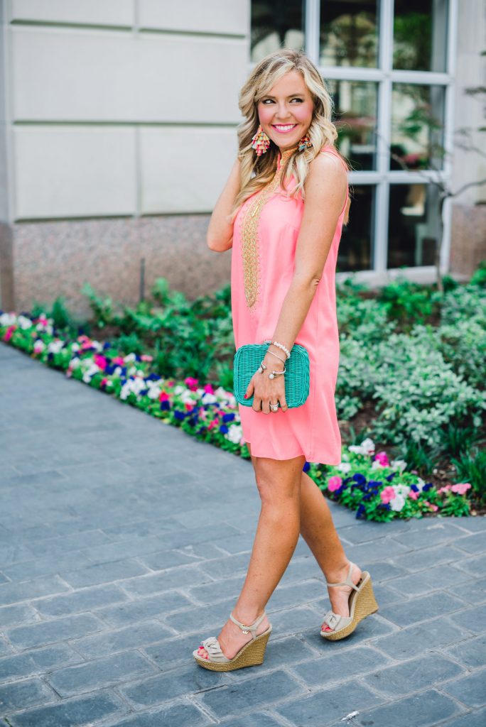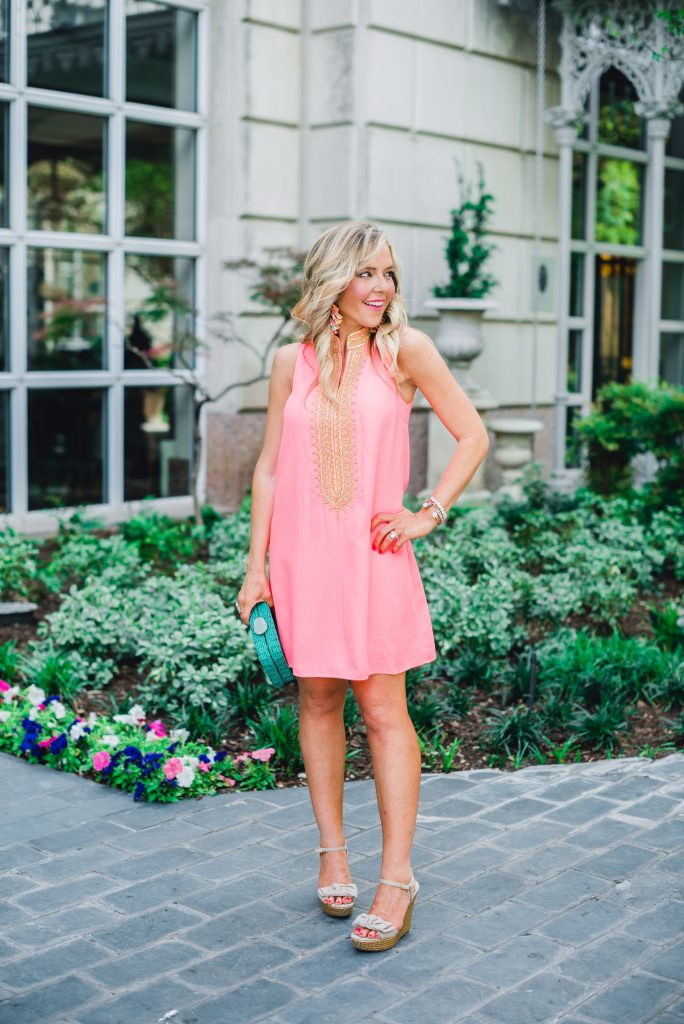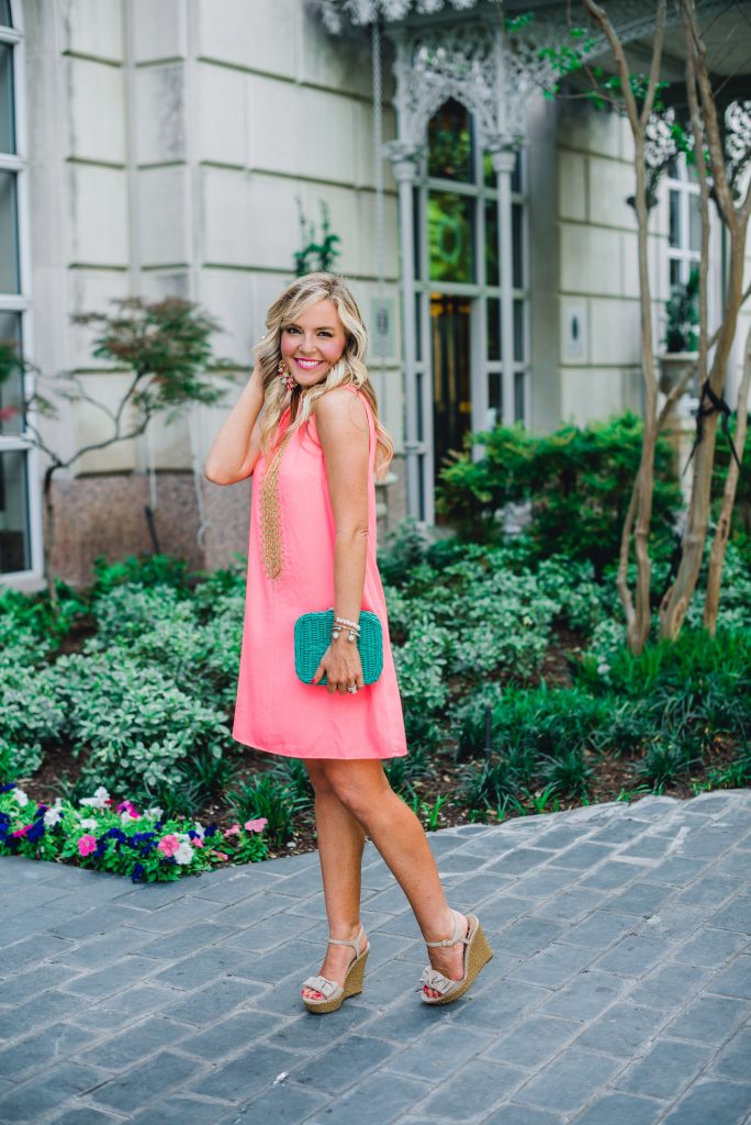 It’s not quite orange and it’s not quite pink-it’s a happy combination of the two and it’s coral-tastic and I’m a BIG fan for summer! It’s no surprise that I went gaga over this gorgeous gold and Jane Coral Shift Dress from Lilly Pulitzer… it’s totally wedding guest appropriate, ready for beach pics on vacation, or just a special occasion pretty for those who want to add a pop of punch to their closet.