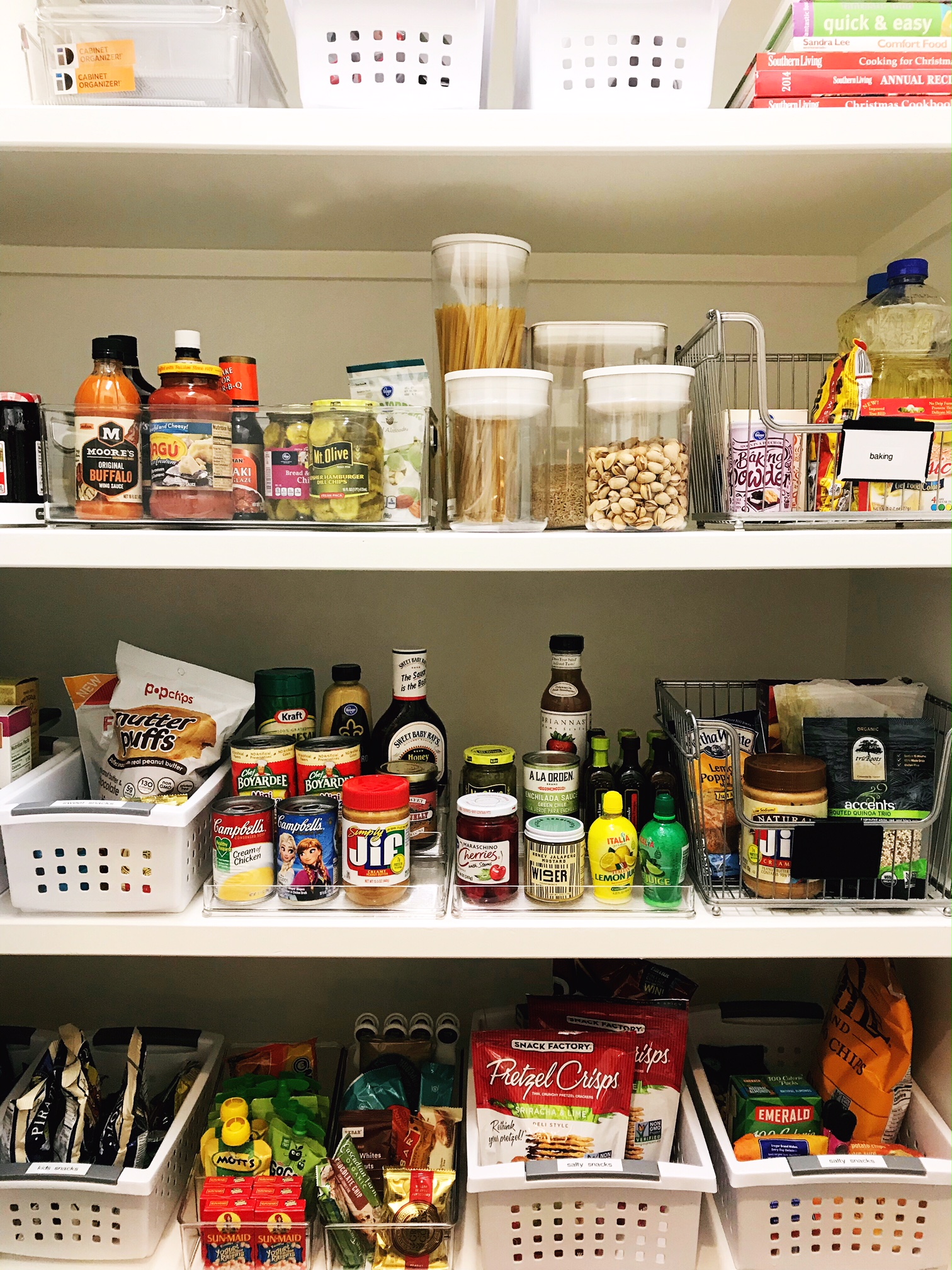 See all the amazing storage bins and baskets I used to organize the refrigerator and our kitchen pantry?? These are helping me toss the cardboard boxes, eliminate the clutter and keep my food fresh longer! A little organization goes a long way… it also helps the hubby and kiddos find their snacks when they get a little hangry ;).