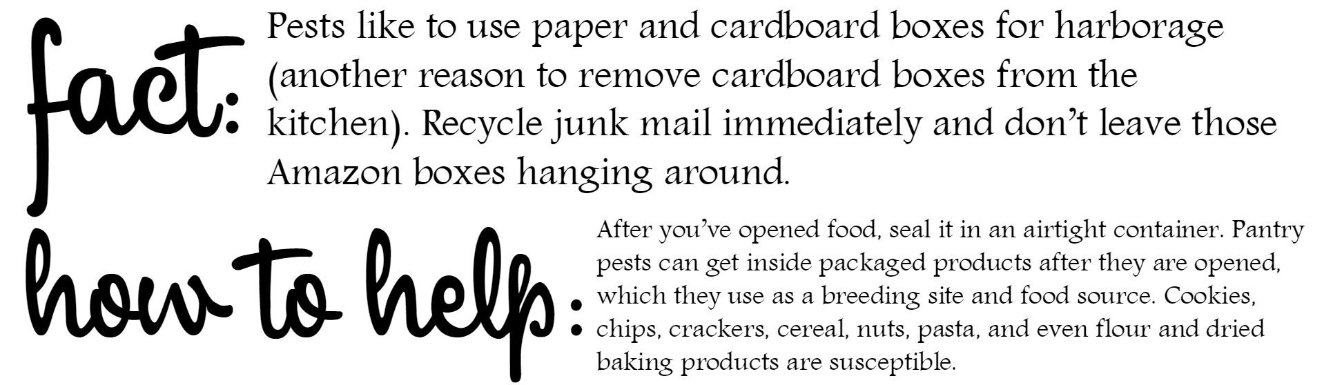 The smell of open food and empty boxes are a natural draw for pests, so I’m wanting to share some of my favorite tried-and-true tricks to help you keep those little insects OUTSIDE where they belong — say bye-bye to ants, flies, moths and more.