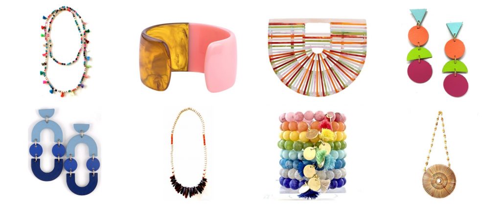 Chiquita Necklace | Resin Half Dipped Cuff Bracelet [now only $20] | Rainbow Acrylic Bag [40% off–YIPPEE] | Geo Party Drops | Colorblock Ion Earrings |  Peacock Necklace | Sorrento Stackers [just $12 each] | Round Crossbody Bag