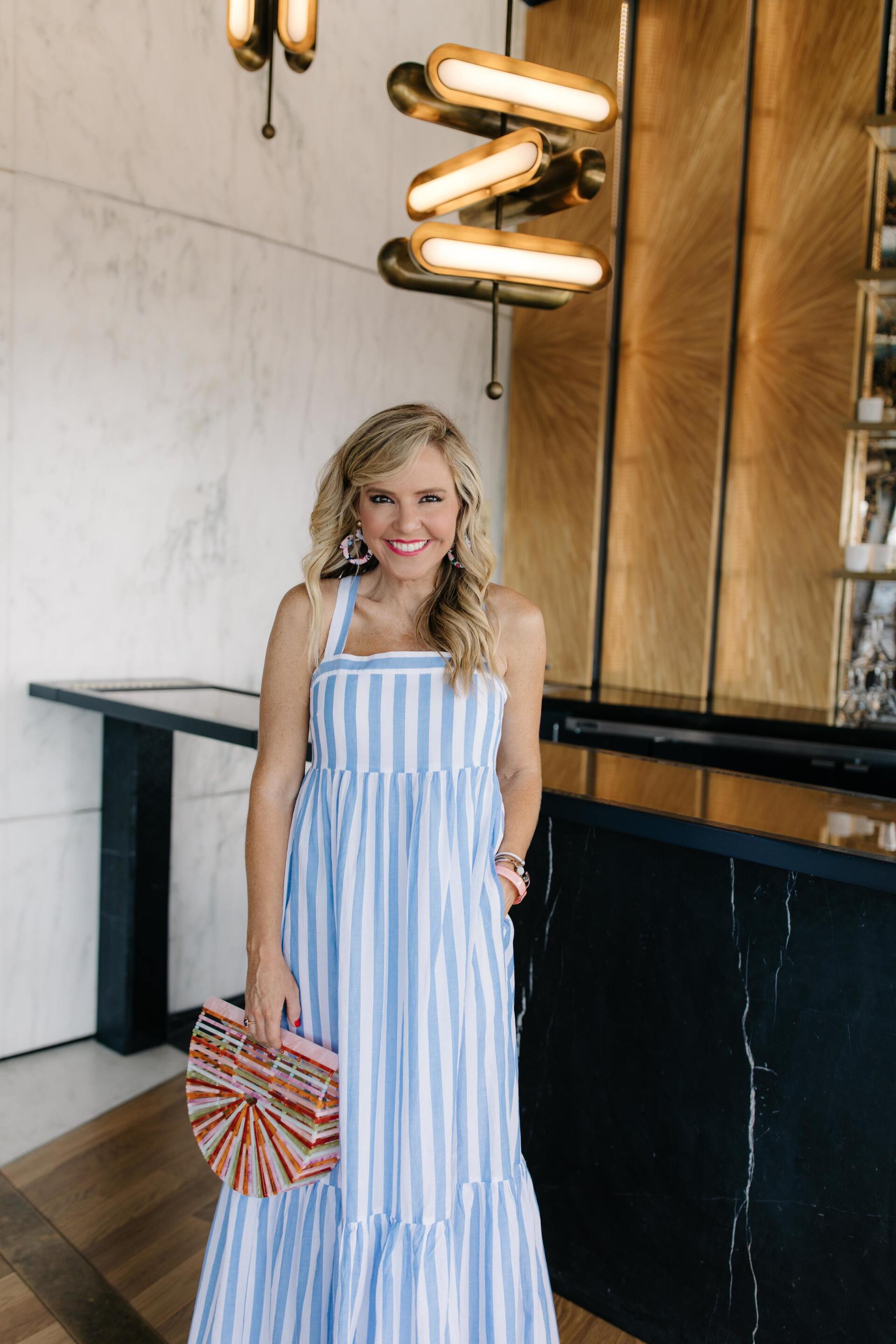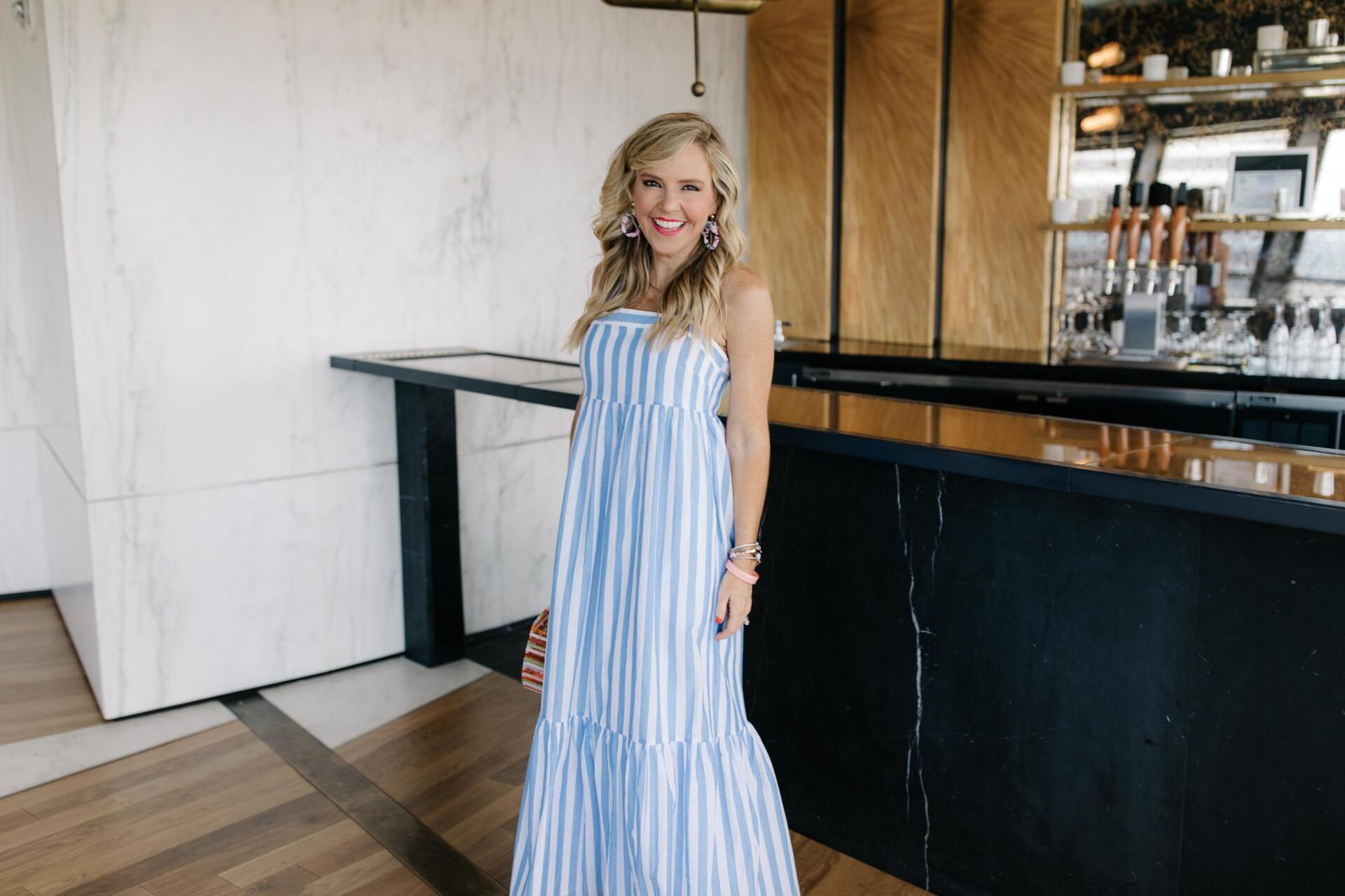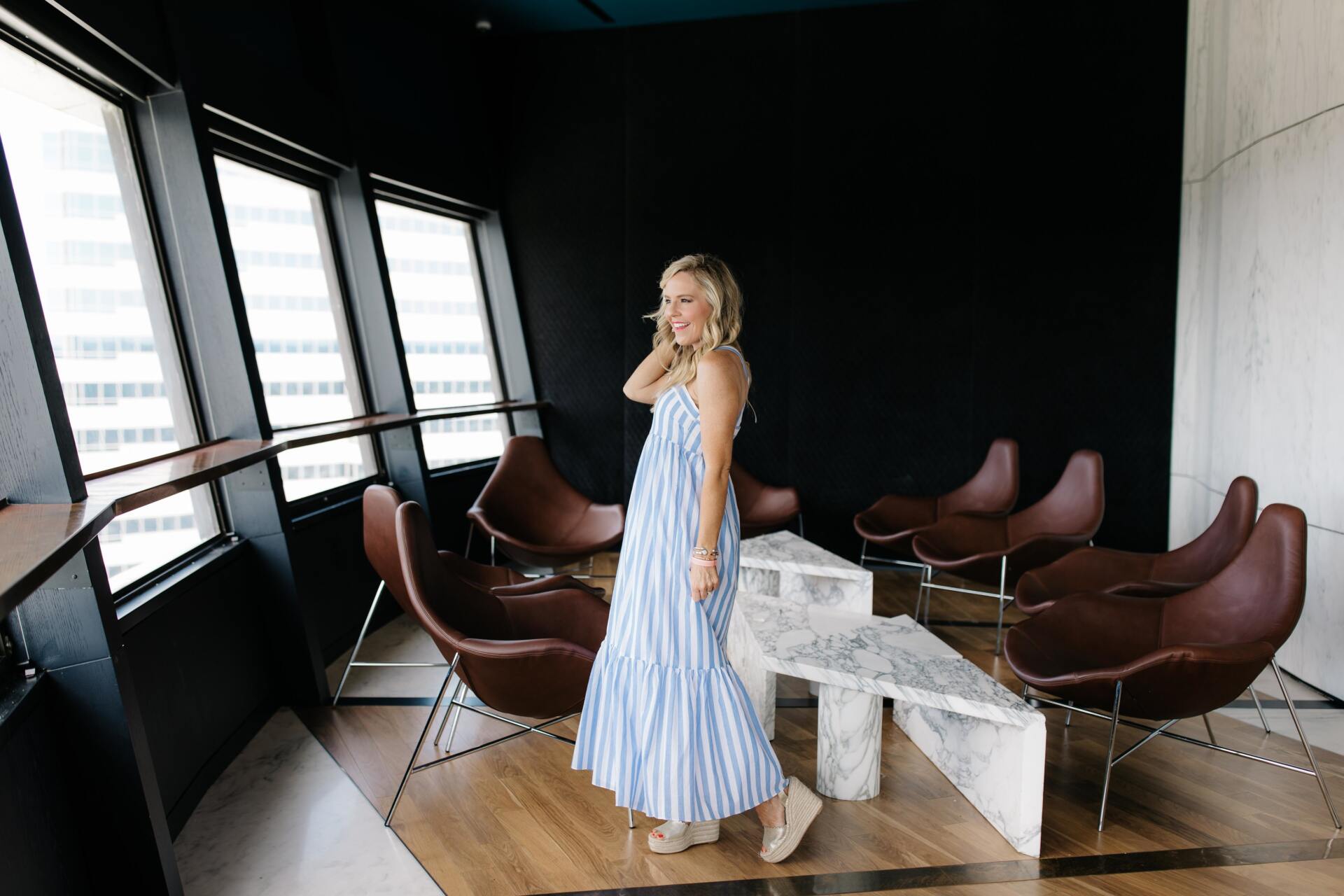 Take me up to the top of the penthouse please… the views from the top of the hotel were incredible! The perfect spot for a few photos of this fun striped maxi dress–a fun take on a classic silhouette, perfect for celebrating the dog days of summer in a cool and comfortable style that looks great and feels even better.