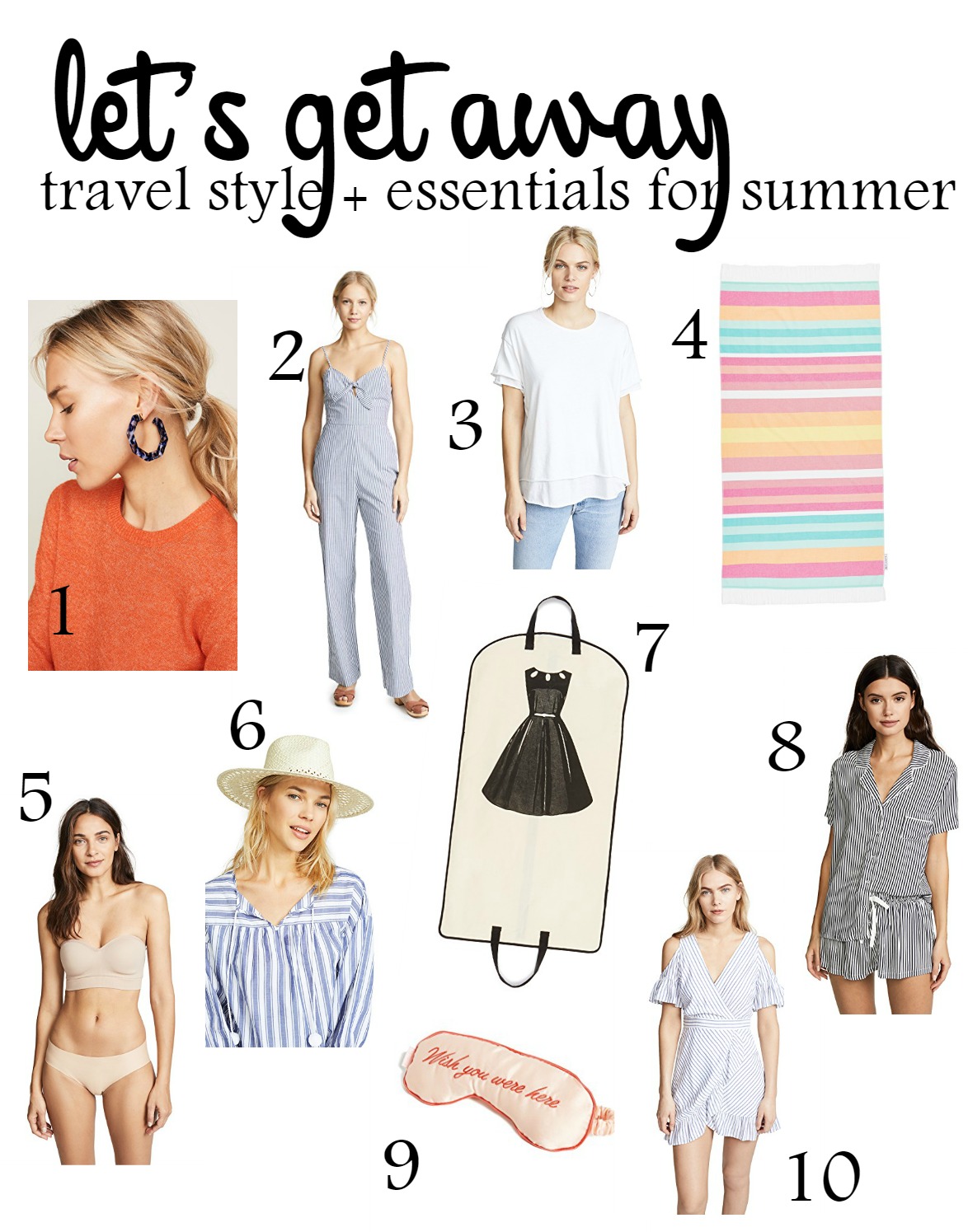 1 Octagon Hoop Earrings | 2 Massa Tie Knot Jumpsuit | 3 Cloud Nine Tee | 4 Fouta Striped Towel | 5 Peyton Strapless Convertible Bra [just grabbed this and LOVE the versatility for travel] | 6 Hampton Fedora | 7 Garment Bag | 8 Always Stripe Pajama Set | 9 Wish You Were Here Mask [such a fun gift for a friend that is always living in her suitcase!]| 10 Fong Wrap Dress