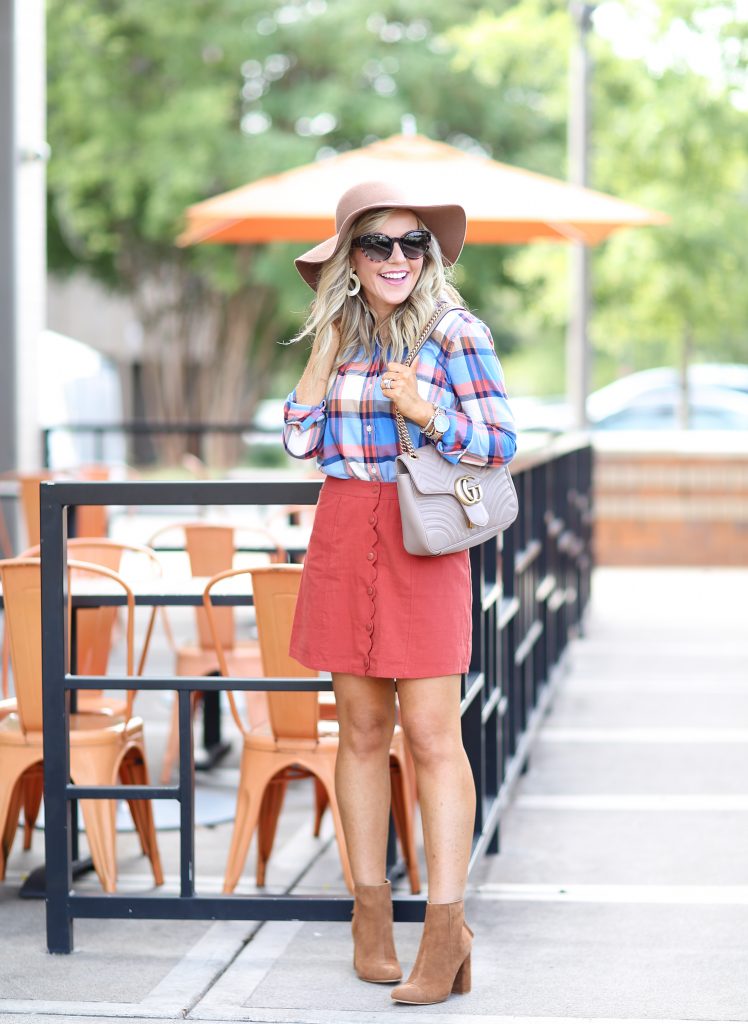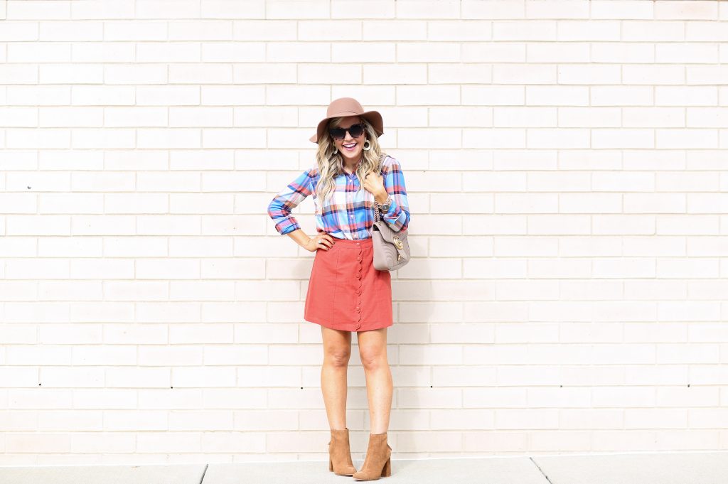 Plaid Button Up | Scallop Orange Skirt | Perez 90MM Booties | Floppy Hat |