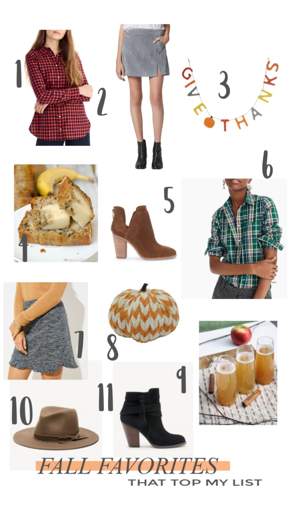 1 Heritage Navy Button Up 2 Suede Miniskirt 3 Give Thanks Banner 4 Cream Cheese Banana Nut Bread