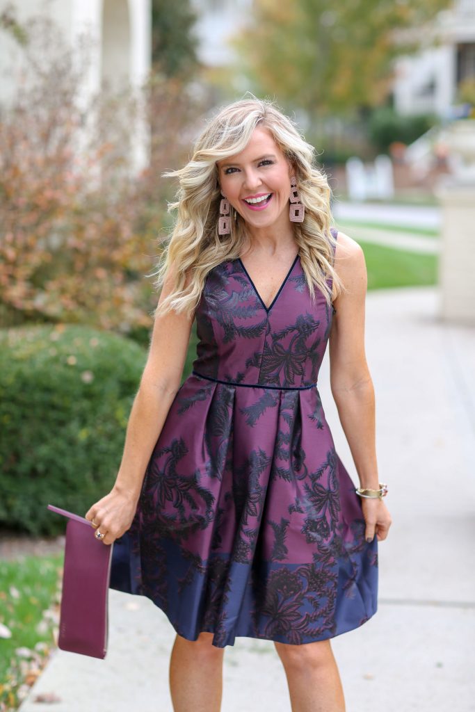 Flattering and sparkly, all in one… yes please! This Jacquard Fit and Flare Dress has just the right amount of structure and shine and such a special color palette of plum, navy and black. I’m wearing the size 2 for reference, which leave room for dancing and cocktailing = signs of the perfect party for me! It’s also impeccably well made for the under $200 price tag and is a great year-round fabric. Of course I paired it with their Jayvid Platform Sandals in pink to make it a little more playful… now I am ready to go.