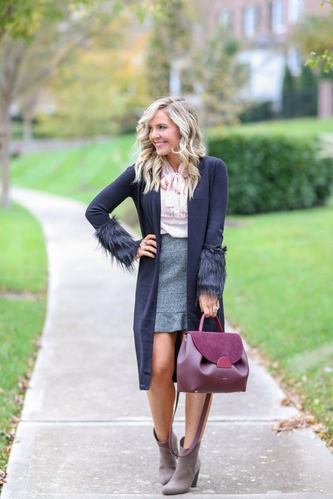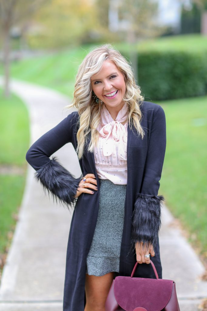Moving right along, it’s no secret that I gravitate towards anything and everything FUR! I stopped dead in my tracks when I stumbled upon this Faux Fur Cuff Cardigan [in black nonetheless] and knew it was coming to live in my wardrobe ASAP. So fabulous, yet still chic and low-key enough for everyday, the longer length is great for ladies of all heights and it has winter wear written all over it. Think cocktail party, Christmas Eve overcoat–you get the jist! Again you see I’ve got it on with my Creestal Booties too ;).