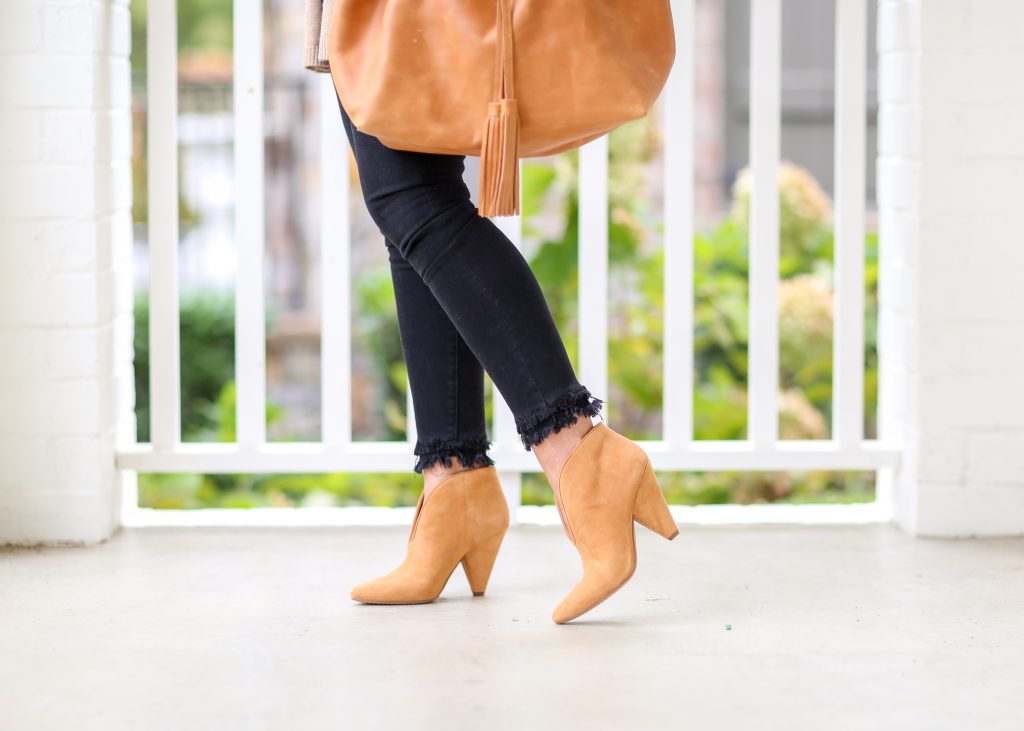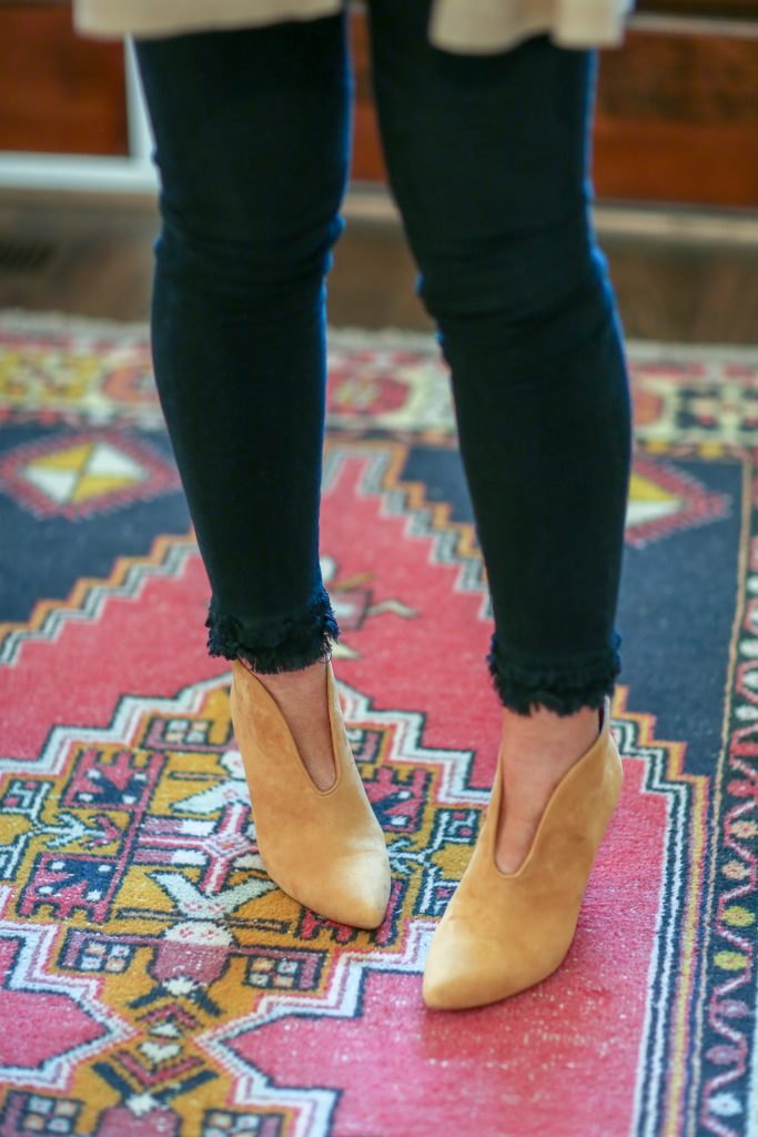 Moving onto my new love affair with this new-to-me cone heel booties, The Mitsen in Creamy Caram Suede! Super unique and special, I am obsessed with the cut-out detail and the fun pyramid heel design. I paired them with suple simple black jeans and a long length cardigan, but have already styled them with skirts and dresses, too. Plus that cognac colorway can pair perfectly with EVERYTHING in your closet! But if you’re searching for other color options, they come in sophisticated black and burgundy as well.