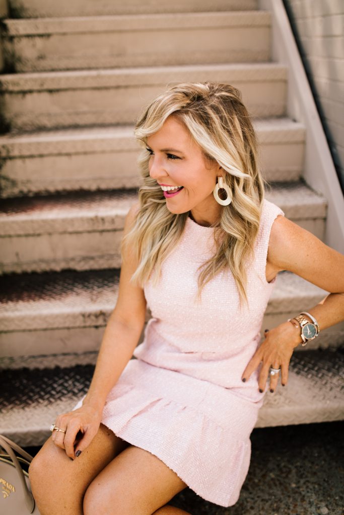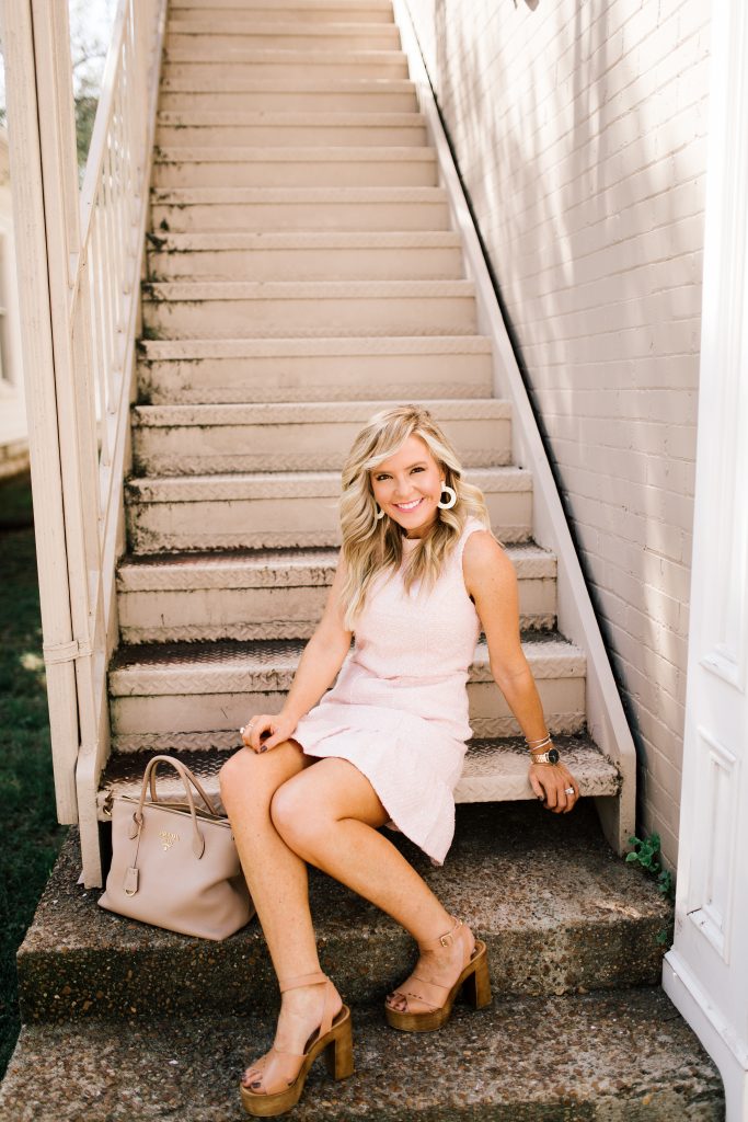 Playing to everything pink just like Coco Chanel would approve of, I fell in love with the light color palette, and the versatility of this dress. It runs a bit more fitted, so I sized up to a small, and it fits perfectly. The front pocket detail gives note to a touch of mod, while the flair hem keeps it refined and stylish. If you’re looking to take this all the way to winter, you could totally add this Margot Tie Top in Ivory or Blush for cold weather, winter days… perfect for the office and beyond.