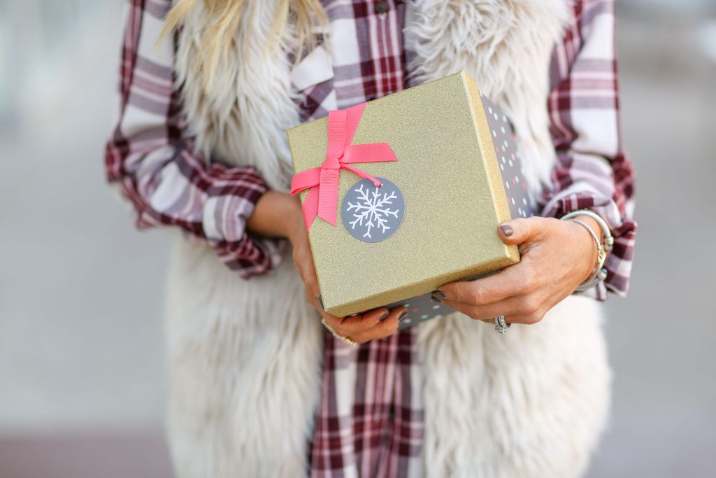 What I love about this casual + cute outfit is that it incorporates the holiday flair with fur, plaid and faux leather all in one easy ensemble. I can’t tell you how many compliments I’ve gotten on this Melange Italiam Fur Vest. It’s super cozy, chic and I love the longer length WITH pockets of course! Once I layered it up with the plaid button-up Renegade Boyfriend Shirt and Burgundy Faux Leather Leggings, it was all complete. I’ve told you I am OBSESSED with Spanx Leggings, and once I saw this colorway I grabbed them instantly!
