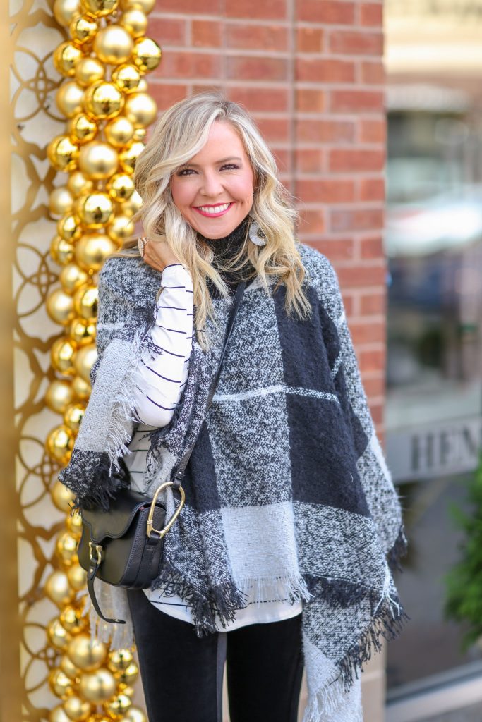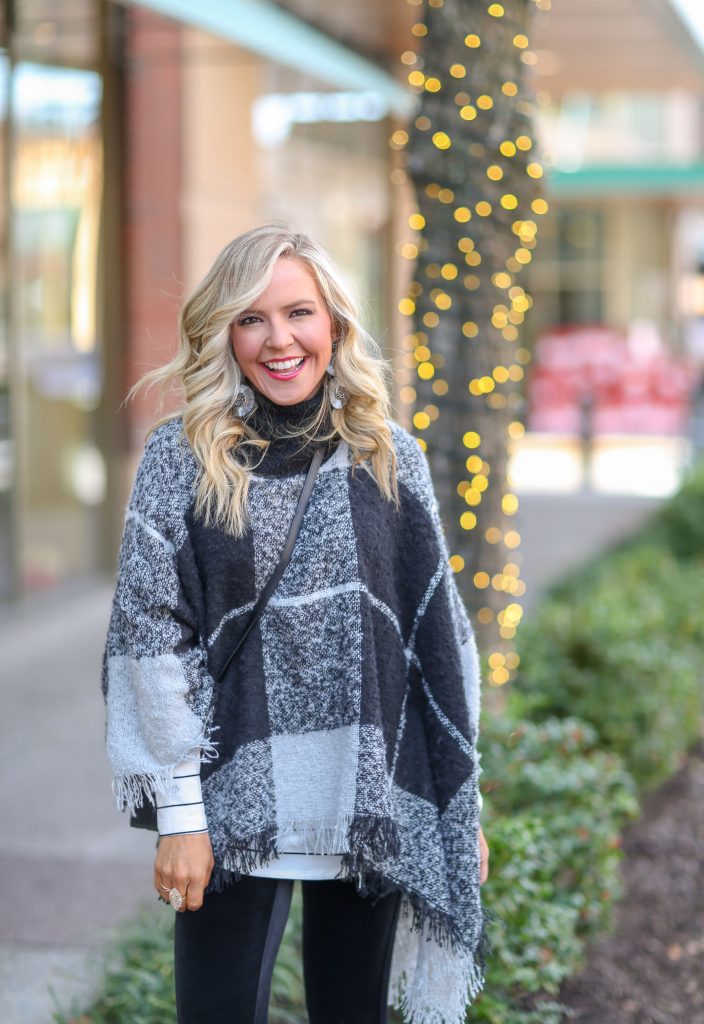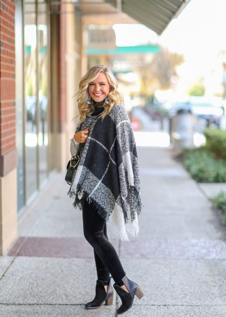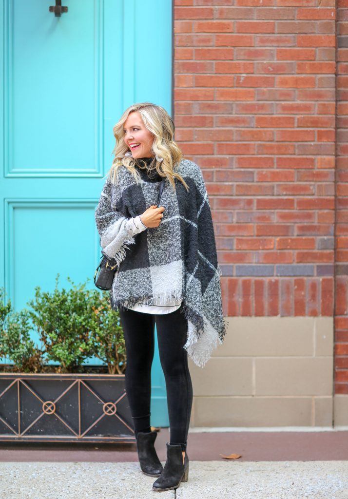 Even Better Plaid Poncho | Billie Striped Tunic Tee in White | Spanx Velvet Leggings in Black | Later On Booties