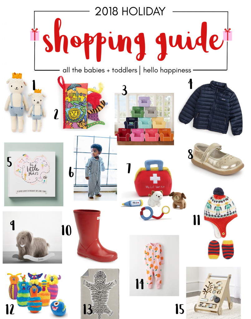 1 Sebastian the Lamb Cuffle + Kind Doll [they donate 10 meals to kids in need with every purchase!!] | 2 Rainbow Tails Book [always a go-to gift for me] | 3 Personalized Anywhere Chair [THE best for toddlers and one of our personal favs] | 4 Down Sweater Jacket | 5 The Little Years Toddler Book | 6 Petite Plume Gingham Romper | 7 My Lil Vet Set | 8 Gold Mary Janes [classically cute!!] | 9 Woolly Mammoth Rocker [SO wish I had someone to buy this for!!] | 10 Hunter Boots [a staple in my girls’ Christmas for years now] | 11 Hat and Mitten Set [SO stinking cute] | 12 Monster Bowling Set | 13 Go Get Em Tiger Blanket | 14 Night Night Orange Sleeper | 15 Baby Push Walker