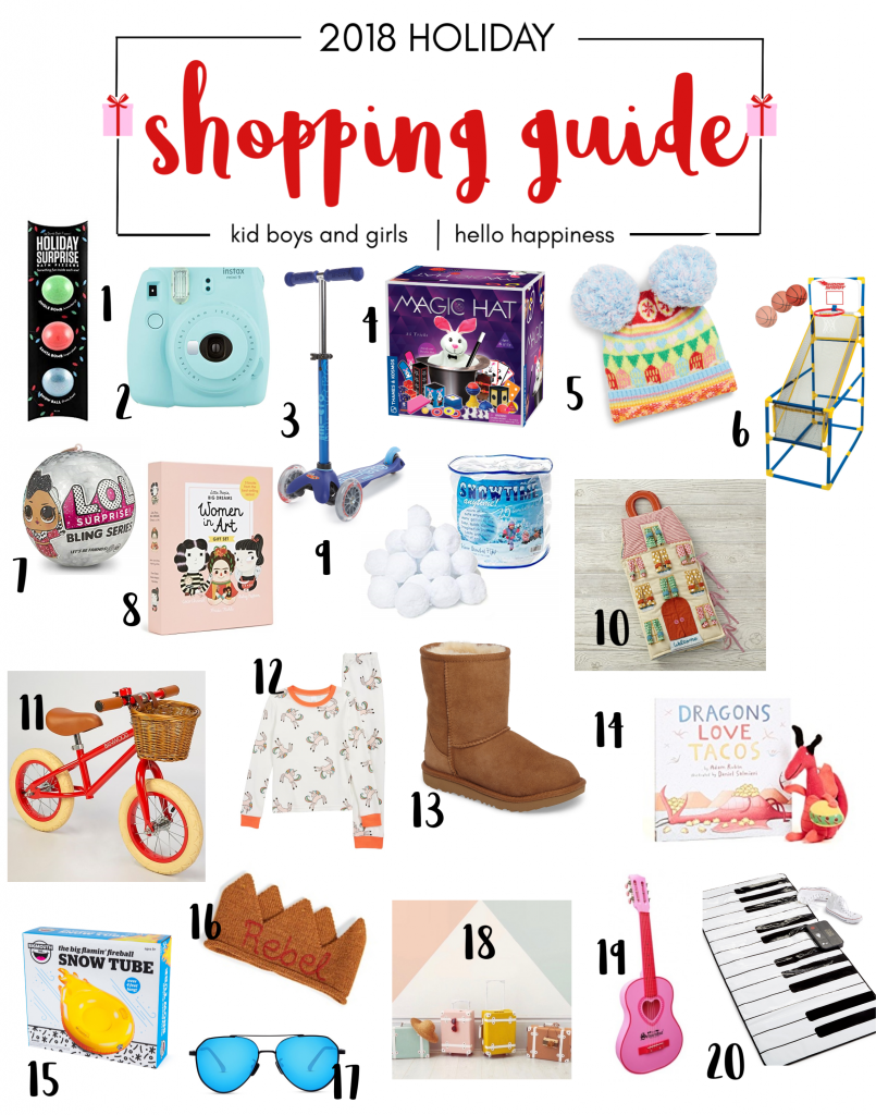 1 Da Bomb Holiday Bath Bomb Set | 2 Fujifilm Instax Camera | 3 Micro Kick Scooter | 4 Magic Hat Kit [for those little magicians] | 5 Fair Isle Pom Pom Hat [my girls just got these and we are OBSESSED] | 6 Hoop Shot Basketball Game Set | 7 LOL Surprise Series Bling Ball | 8 Little People Big Dreams Book Set [oh yes girl power!!] | 9 Indoor Snowball Pack [trust me, these are SO MUCH FUN] | 10 Carry Home Dollhouse [the girls got this last year and LOVE it] | 11 Red Balance Bike [ummm I WANT THIS] | 12 Unicorn Pajamas | 13 Ugg Classic Boots [gender neutral + perfect for cold weather days] | 14 Dragons Love Tacos Book and Animal Set | 15 Flamin’ Fireball Snow Tube [so you’ll be ready when that major snowstorm comes!] | 16 Kids Rebel Crown Hat | 17 Kids Dash Aviator Sunnies [use code NASHVILLETASH for $25 off] | 18 Mini Travel Suitcase [only $79 and hands down my fav find this year] | 19 Six String Guitar [perfect gift to leave at the grandparents house if you know what I mean] | 20 Piano Dance Mat