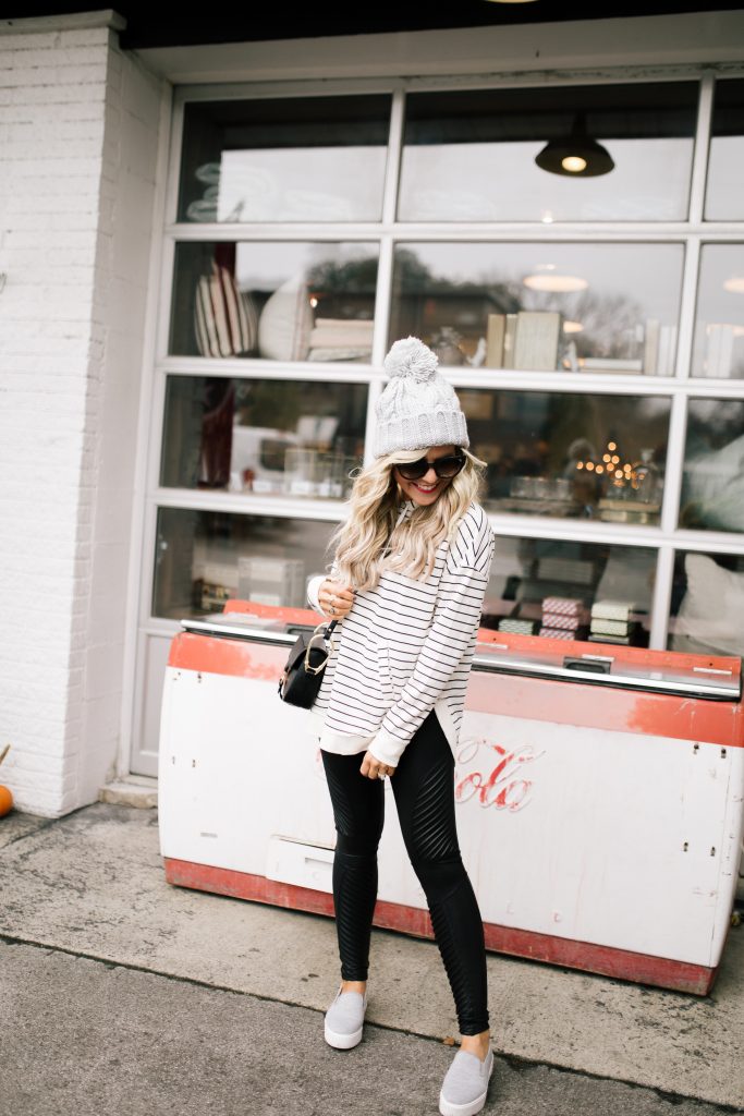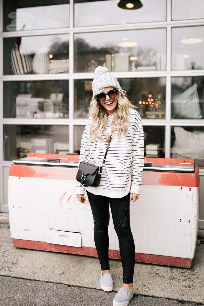 The best part is that it looks put together, but those Faux Leather Moto Spanx Leggings are holding everything in and my comfy Striped Pullover Hoodie is keeping me warm, all with a little extra help from my favorite Pom Pom Beanie of course [P.S. use my code HELLOHAPPINESS20 for 20% off the pullover and hat]. And of course don’t forget about my latest crossbody obsession, the Sancia Gigi Bag + my favorite Grey Fabric Sneaker Slides.