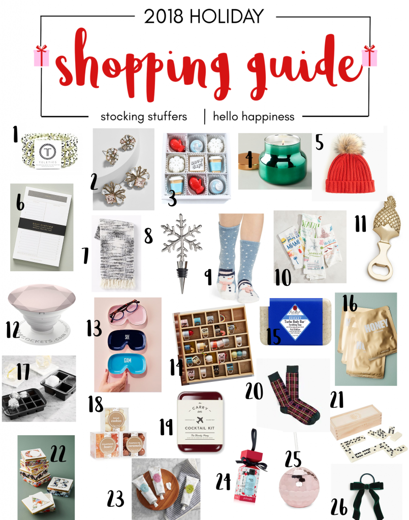 1 Teleties 3-Pack Hair Ties [I swear by them for creasless ponytails!] | 2 Loria Earring Stud Set [only $10] | 3 Snow Day Chocolate Set | 4 Mini Capri Candle [THE best] | 5 Pom Pom Beanie [so many color options] | 6 Perfect Planner Notepad | 7 Space Dyed Throw Blanket [on sale for $14] | 8 Snowflake Wine Stopper [just $6] | 9 Furry Butter Socks | 10 City Tea Towels [fun for someone with a new home] | 11 Pineapple Bottle Opener | 12 Pop Socket [Jeff gets one every year in his stocking–haha] | 13 Iris Catchall | 14 Vintage Print Coffee Mug [only $5 each] | 15 Turbo Body Soap Bar | 16 Honey Sheet Mask Set [other options available, too]| 17 Ice Cube Trays | 18 Happy Holidays Bento Treat Box | 19 Carry On Cocktail Kit [for that constant traveler… AKA my hubby!] | 20 Tartan Dress Socks | 21 Dominoes Game | 22 Monogram Lidded Jewelry Box [only $14] | 23 Tocca Hand Cream | 24 Philosophy Snow Angel Ornament | 25 Rose Gold Disco Tumbler [only $10] | 26 Velvet Hair Tie