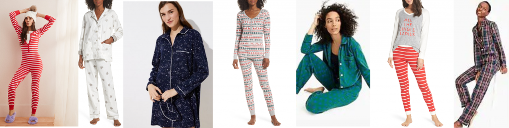 Left to Right: Holiday Stripe Jumpsuit | Snowflake Pajama Set | Star Pajama Dress | Thermal Winter Fest PJs | Flannel Dot Pajama Set | All the Jingle Ladies Set | Vintage Plaid Pajamas