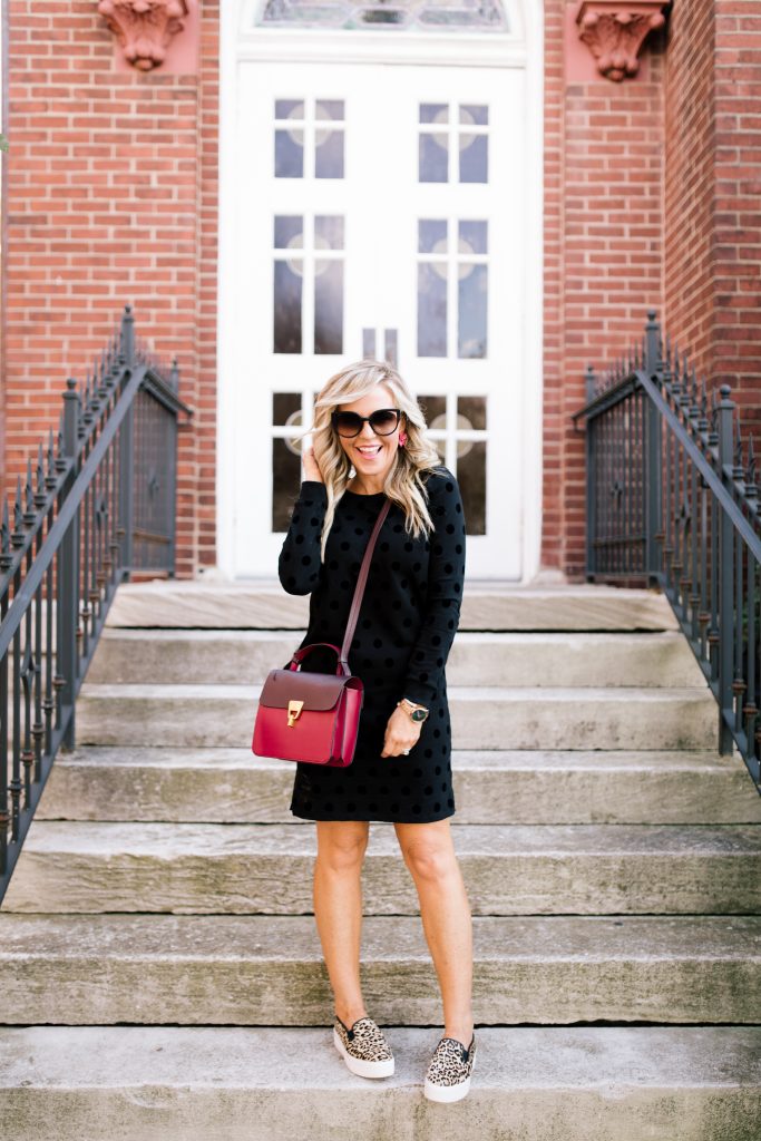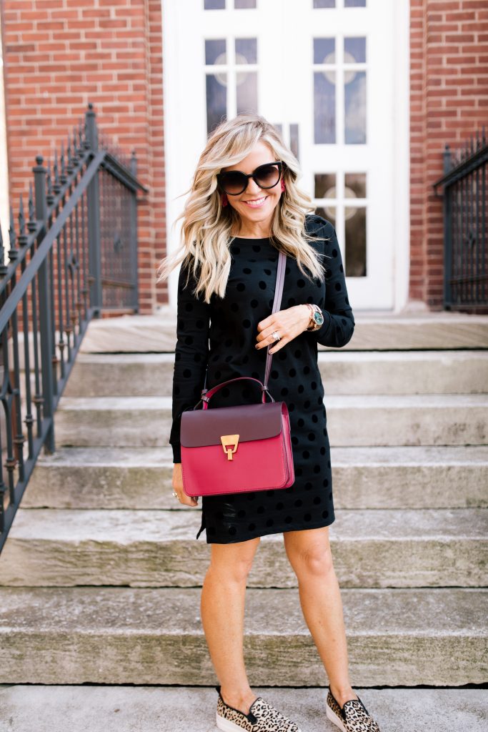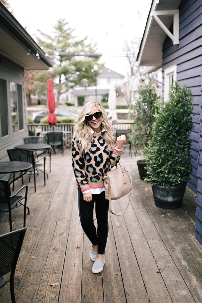 First things first, you know I just HAD to include another new Leopard Sweater, right?!?! This Animal Print Round Neck Jumper [Product #T38/7955] is now on sale for just $38. I layered it up with their classic Cotton Rich Button Up Shirt [Product T43/3030F] an all season staple, now only $32. Finally, I added the Side Stripe Leggings [Product #T57/8489D], which are thick knit pants with added fun and flair for only $31.