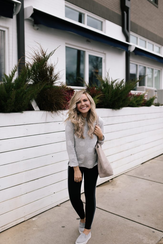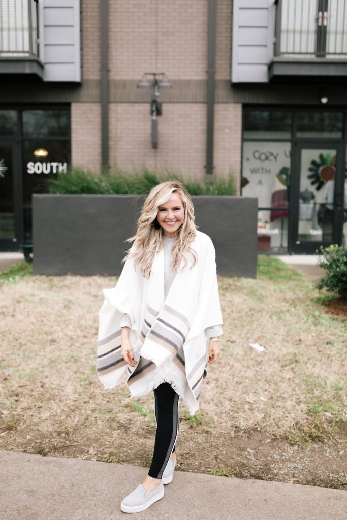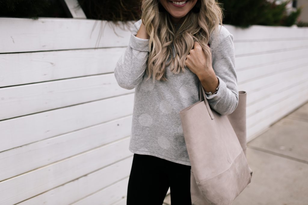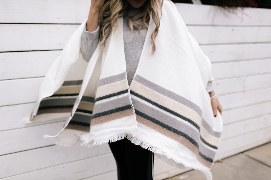 Next up, I’m showing off this uber chic striped Open Front Wrap [Product #T01/7175J]! The winter white color palette mixed with everyone’s favorite neutrals pairs perfectly over any simple tunic or tee AND it just happens to be included in their sale for a mere $31. And if you’re looking to mix it up a incorporate a subtle patterned top with it, try my Spotted Round Neck Long Sleeve Sweatshirt [Product #T41/5214] that is a cute simple addition for $24.
