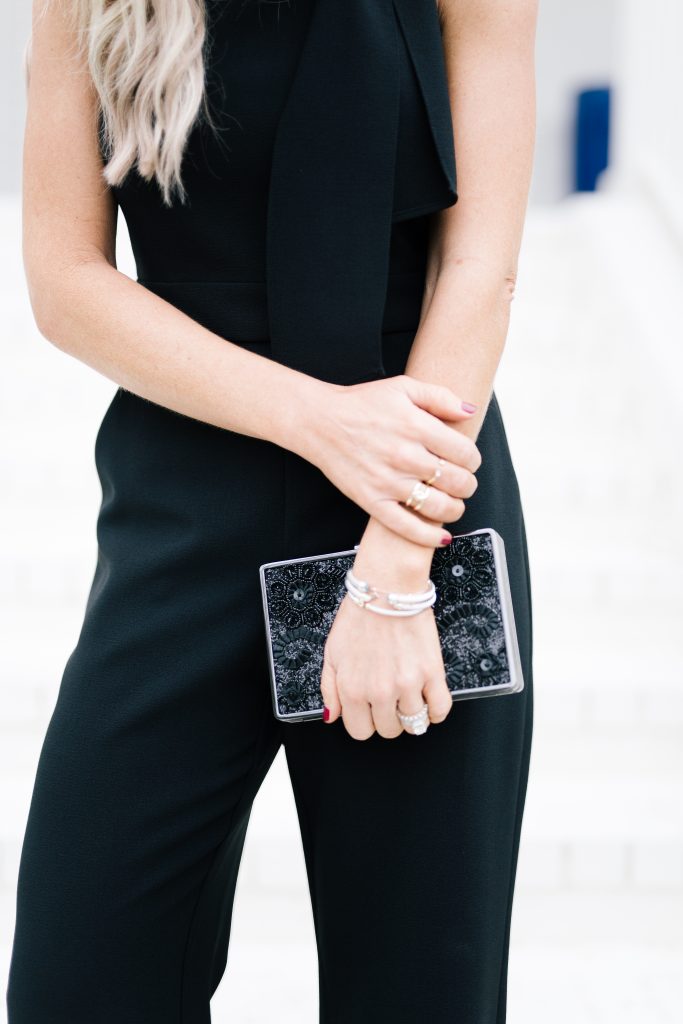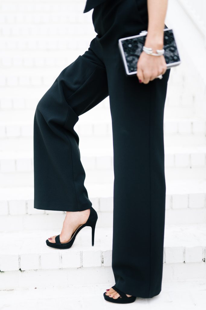 Bow Neck Jumpsuit | Preslyn Platform Sandal | Embellished Dove Clutch | Geometric Black Earrings