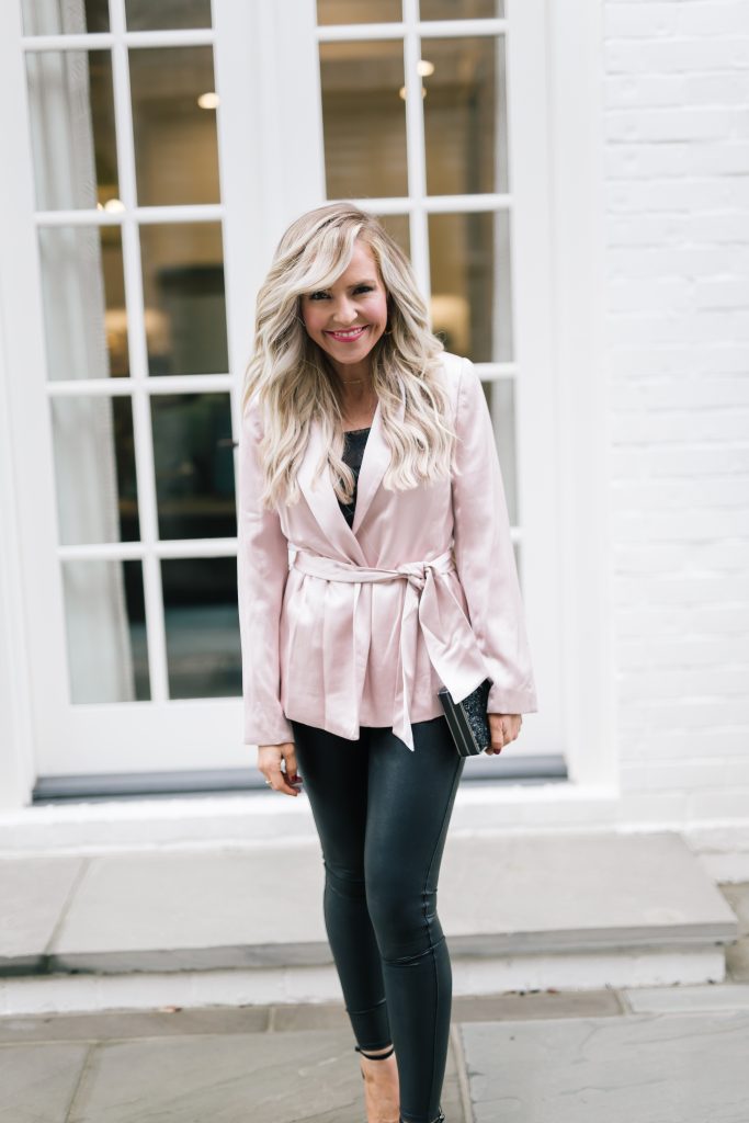 For my second look, I’m thinking all things Pink ladies from Grease in this girly getup! This Satin Belted Blazer is Valentine’s Day ready and dresses up any ordinary ensemble to make it super chic and refined… just a hint of the classic tuxedo, but the light blush color palette plays to all things glamorous.. I paired it with this simple Black Lace Camisole and my go-to Faux Leather Leggings and then incorporated those fabulous Preslyn Platforms again!
