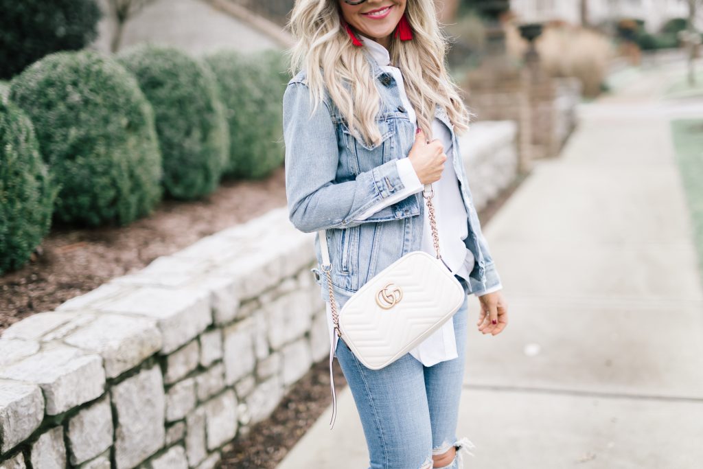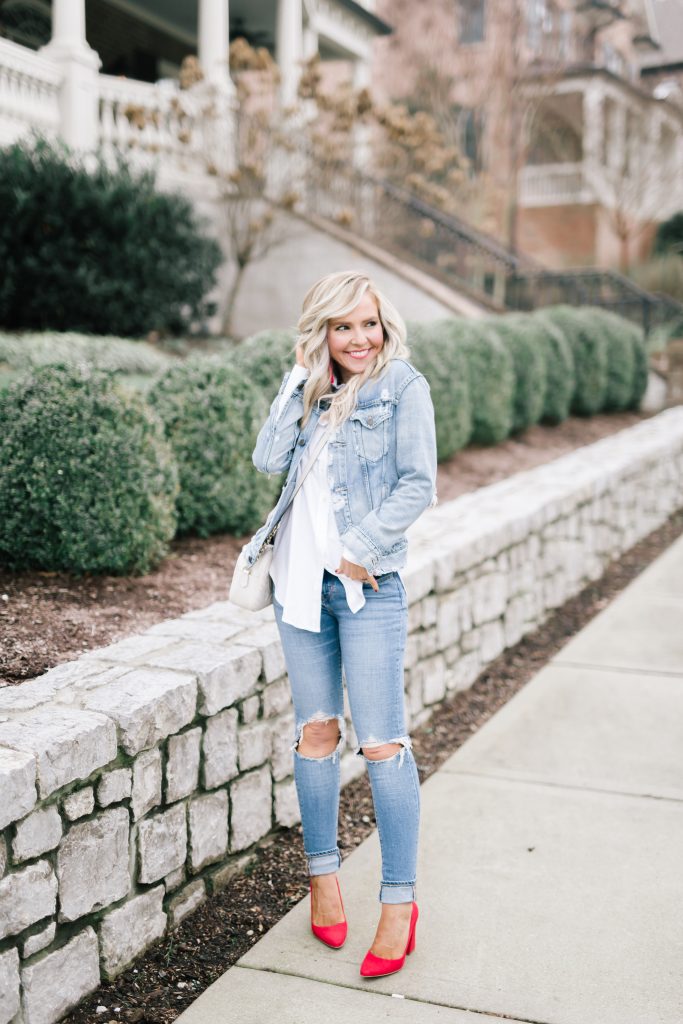 White Tunic Button Up | Distressed Denim Jacket | High Rise Skinny Jeans | Marmont Crossbody | Talise Pumps | Red Earrings [just $12]