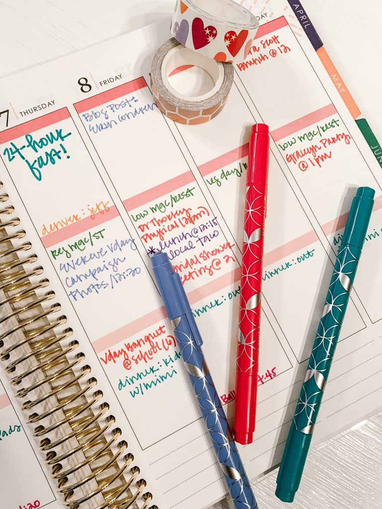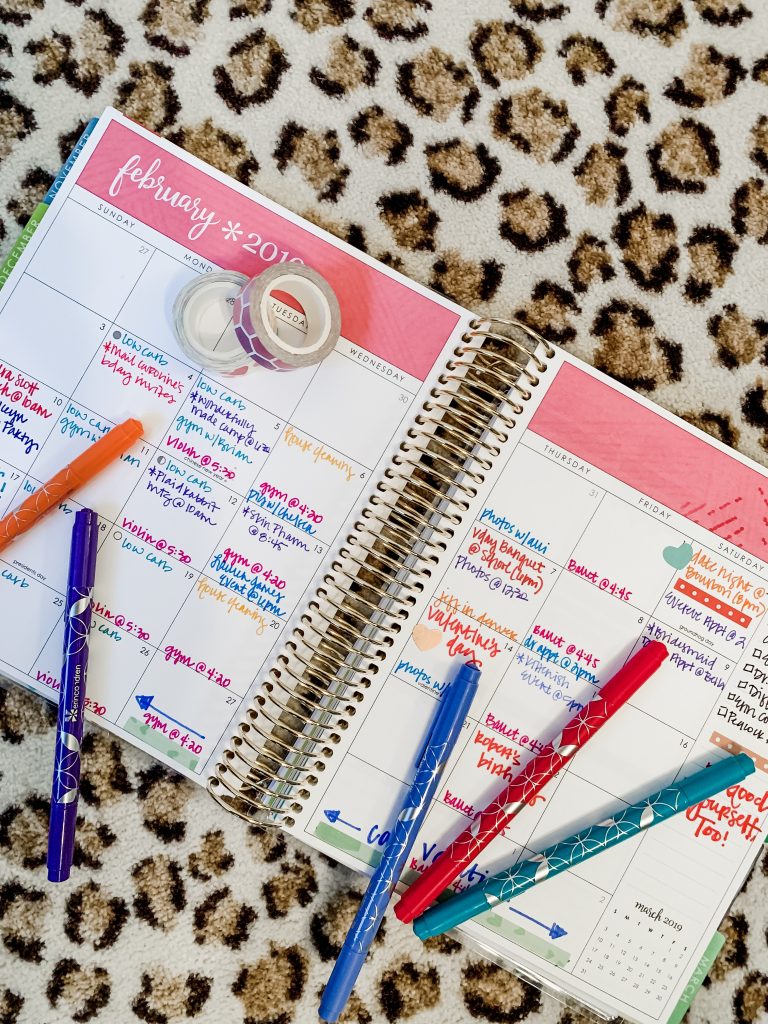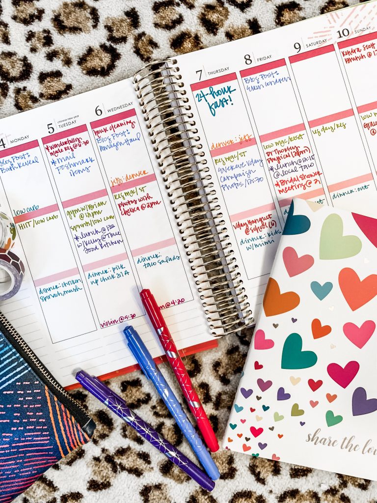 This is critical… yes, you have to PLAN to use your planner!! What a novel idea, right?? I usually do this on Sunday mornings when I am drinking coffee before the kiddos get up… a bit of quiet time to figure out our plans that week and refresh my brain about what we have coming up–menu planning [days eating in/out], other obligations/responsibilities [PTO stuff/influencer events], workout plans for me with FWTFL, travel for Jeff and myself, etc. It usually takes me about 15-20 minutes and it’s super productive so that I don’t go into the week already feeling behind. If you start with your normal weekly things and add in appointments as they are scheduled, it doesn’t feel overwhelming… writing things down for me is also like making a visual checklist and that way hopefully I won’t miss something major.