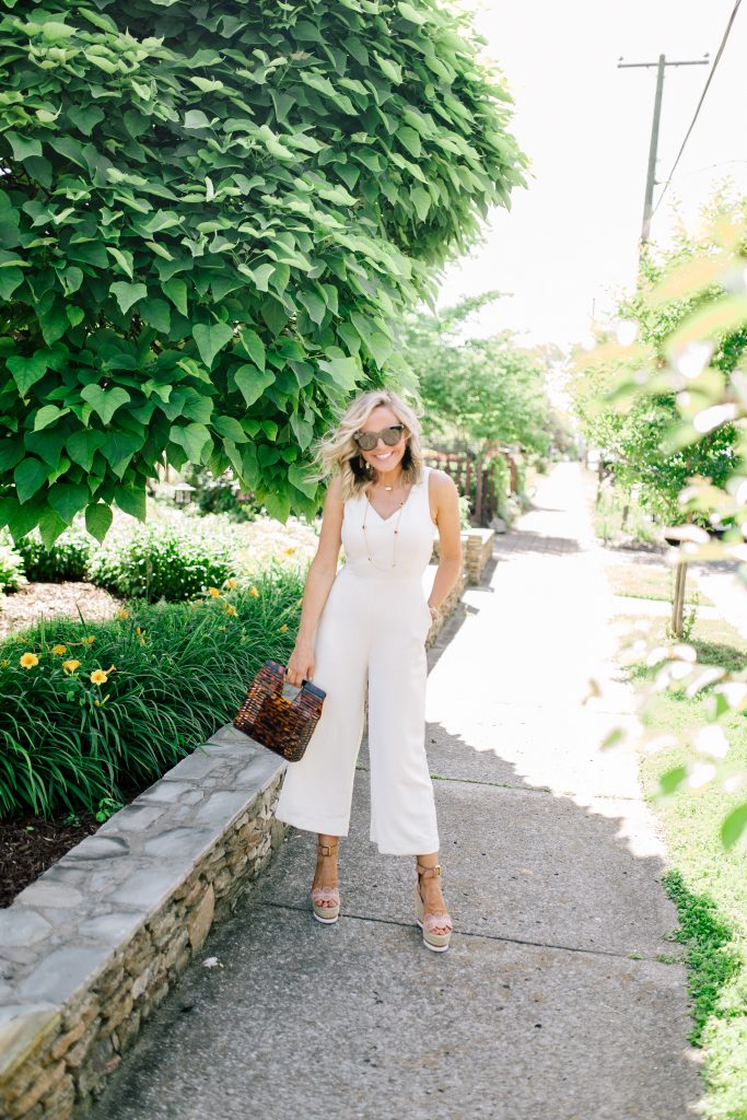 Cream Front Tie Jumpsuit | Glyn Wedges | Acrylic Basket Bag | Air Heart Sunglasses | Loire Station Necklace
