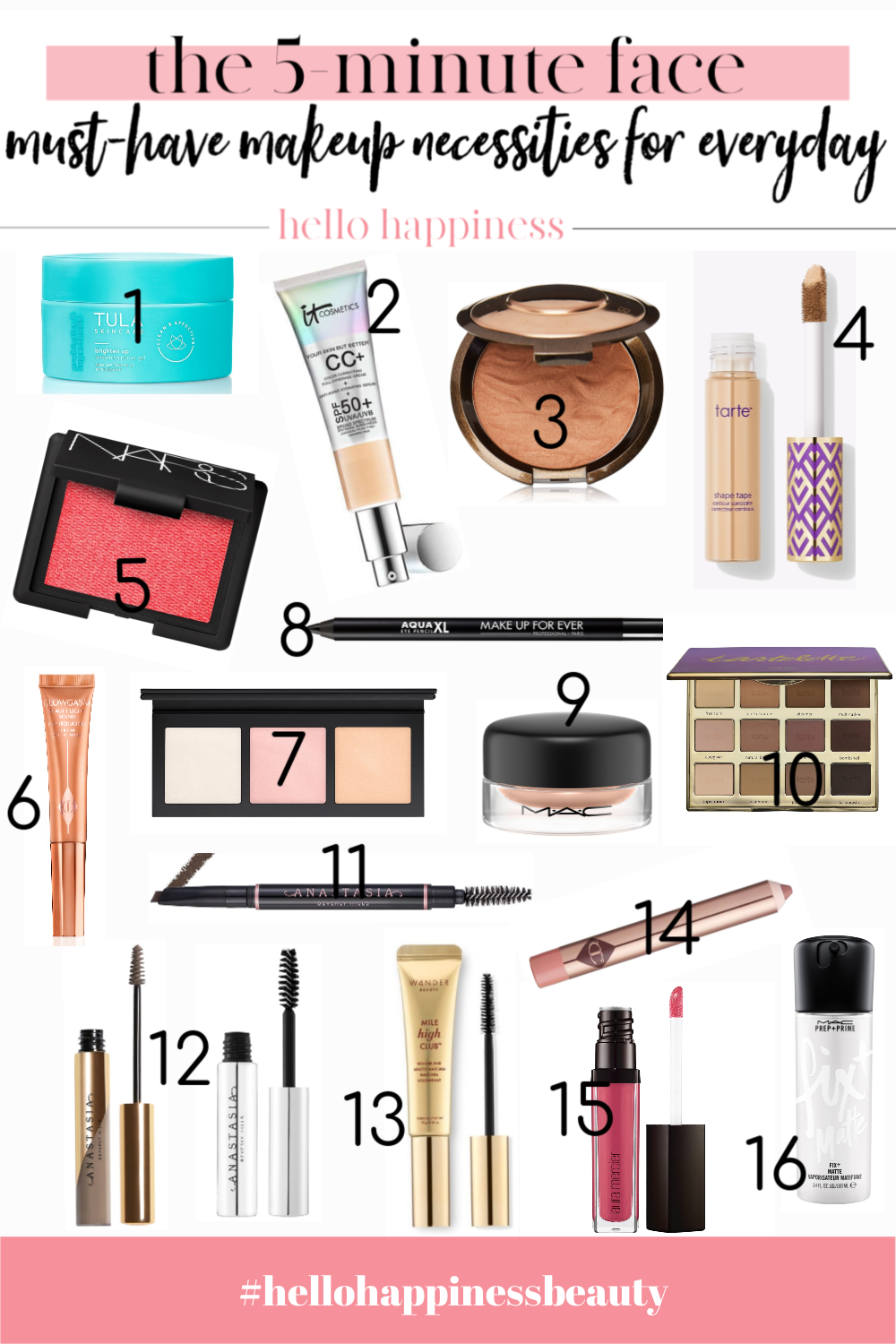 ![5 Minute Makeup Tutorial by popular Nashville beauty blog, Hello Happiness: collage image of Tula Brighten Up Smoothing Gel, iT Cosmetics CC Cream, Becca Sunlit Bronzer, Tarte Shape Tape Concealer, NARS Orgasm Blush, Charlotte Tilbury Glowgasm Beauty Wand Highlighter, MAC Hyper Real Glow Palette, MakeUpForEver Waterproof XL Eyeliner, MAC Paint Pots, Tartelette Eyeshadow Palette, Anastasia Brow Definer in Blonde, Anastasia Beverly Hills Dip Brow Gel, Mile High Club Mascara, Charlotte Tilbury Pillow Talk Lipliner, Laura Mercier Lip Glace Gloss [Color Tulip], and MAC Prime + Prime Fix + Finishing Mist.](https://helloaddamsfamily.com/wp-content/uploads/5-minute-face-683x1024.png)