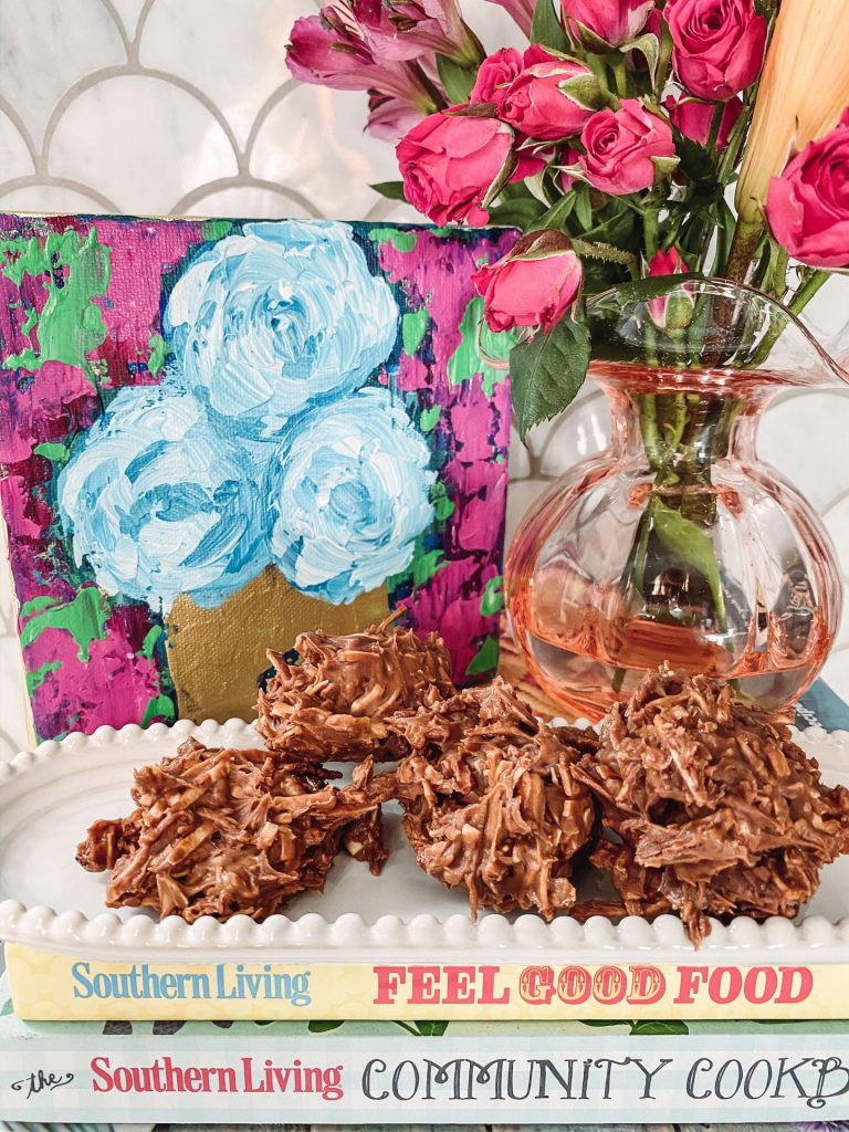 Audrey Hood Canvas | Vietri Incantro White Serving Tray | Hibiscus Glass Bud Vase | Southern Living Cookbooks