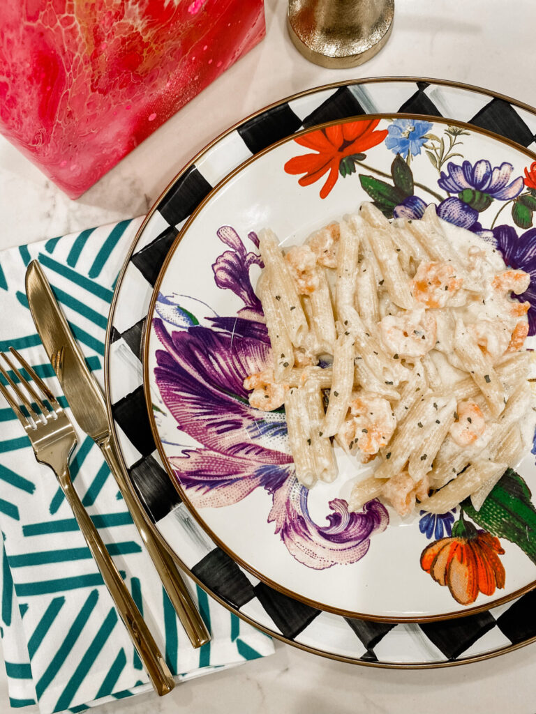 Just last week, I got out my pretty mix and match patterned dinnerware and we ate dinner together as a family in the formal dining room. Honestly, it was SO nice not to be distracted by the sounds of computers + tv screens and spend some QUALITY time together discussing what had transpired throughout our day = something we are trying to be more intentional of this year. And any excuse to get out my beloved Mac-Kenzie Childs Tabletop finds is good enough for me!